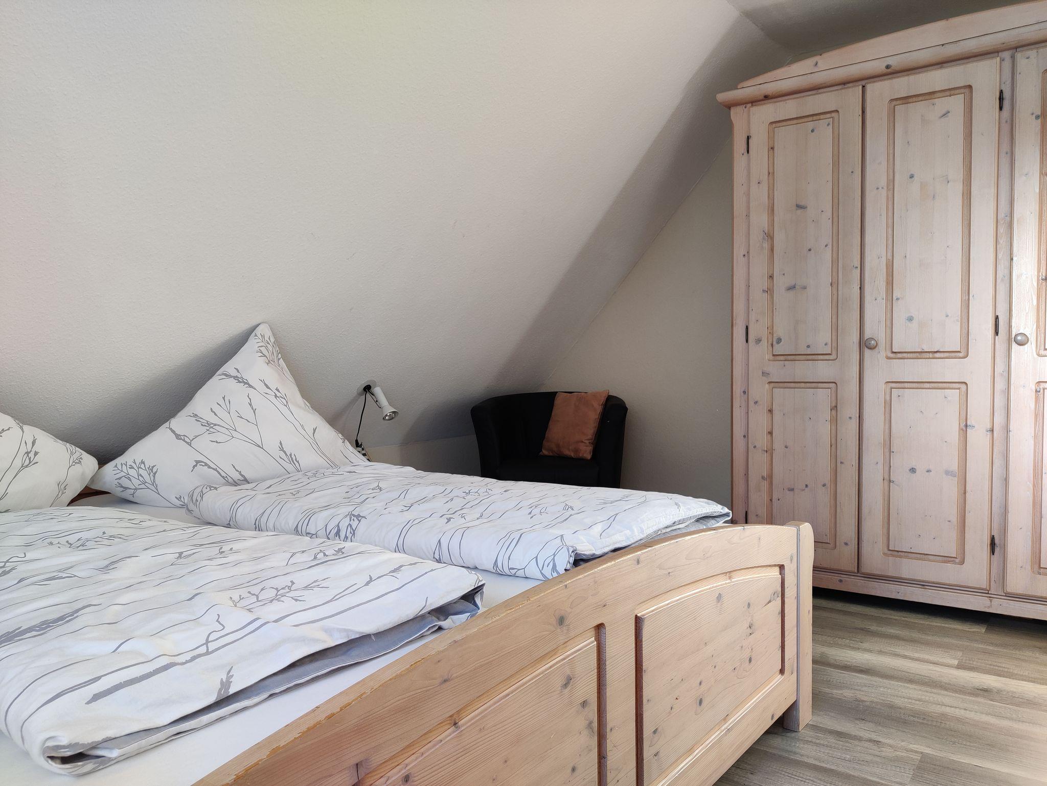 ein Schlafzimmer mit einem Doppelbett (180cm x 200cm), Schrank und Garderobenständer