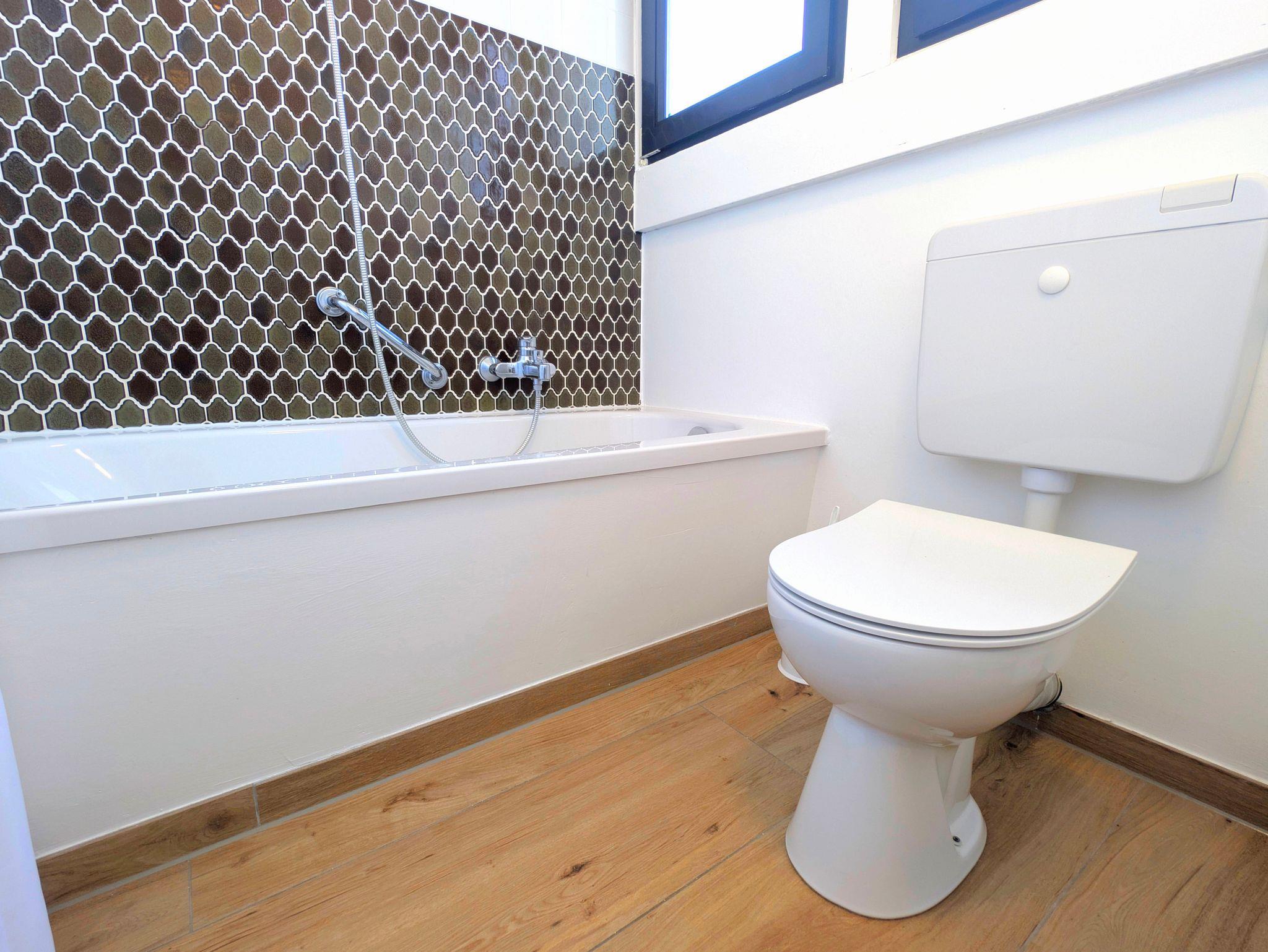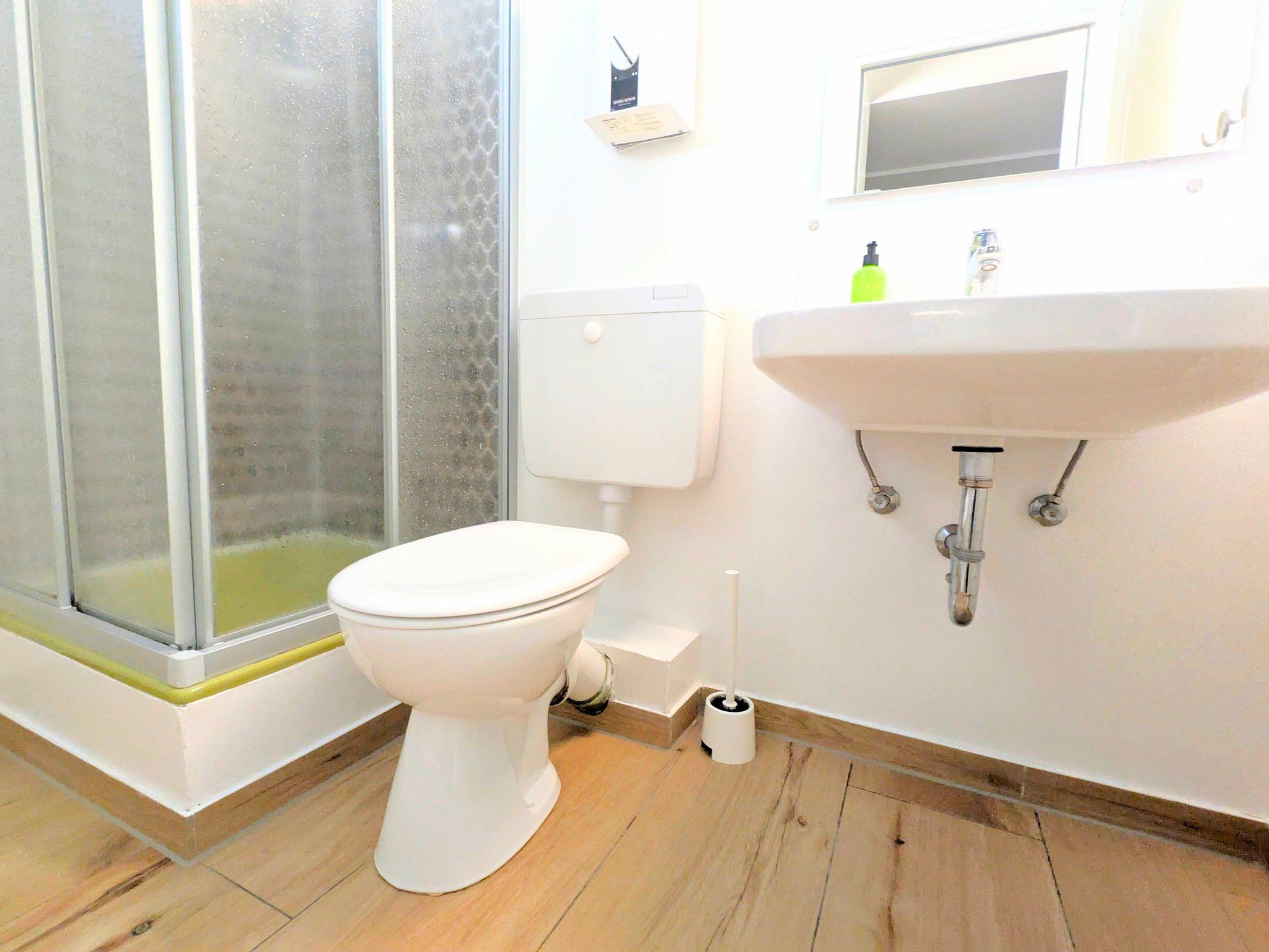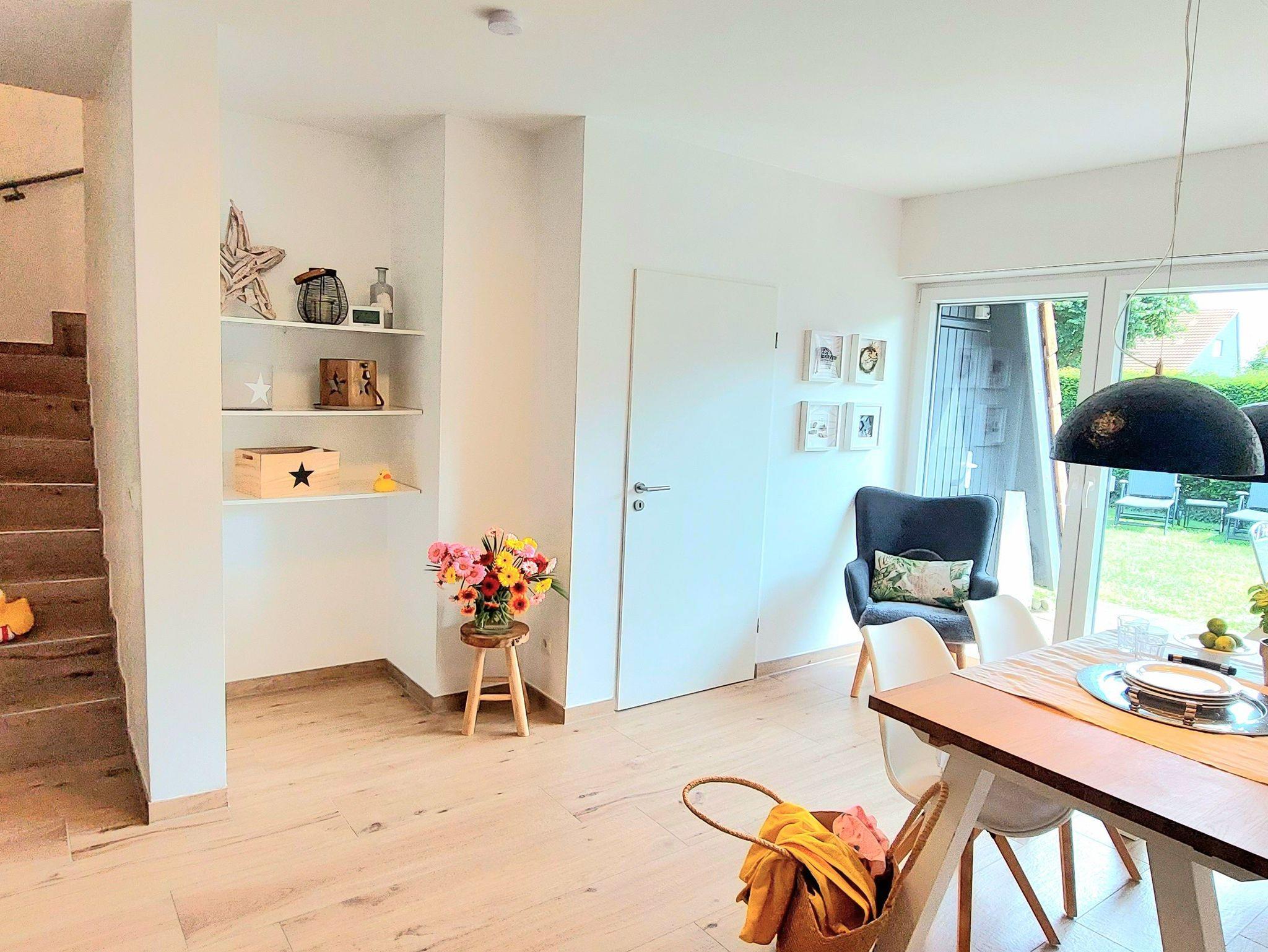 Im Erdgeschoss des Hauses empfängt sie ein heller Wohn-Essbereich mit anliegender Süd-Westterrasse und einem ca. 220 qm großen Garten, der bei schönem Wetter als zusätzlicher Raum genutzt werden kann. Eine räumlich abgetrennte, voll ausgestattete Küche mit Geschirrspülmaschine, Kühlschrank, Tiefkühlfach, Mikrowelle, Kaffeemaschine, Milchaufschäumer, Wasserkocher u.v.m. sowie einem Gäste-WC mit Dusche und Toilette.