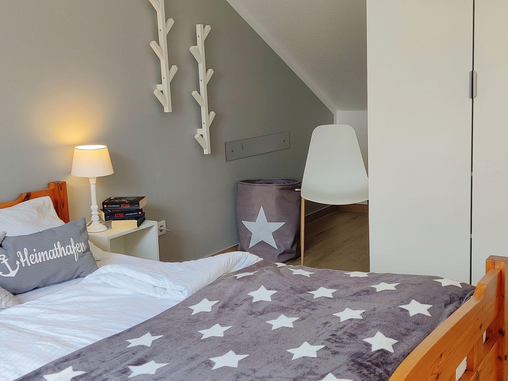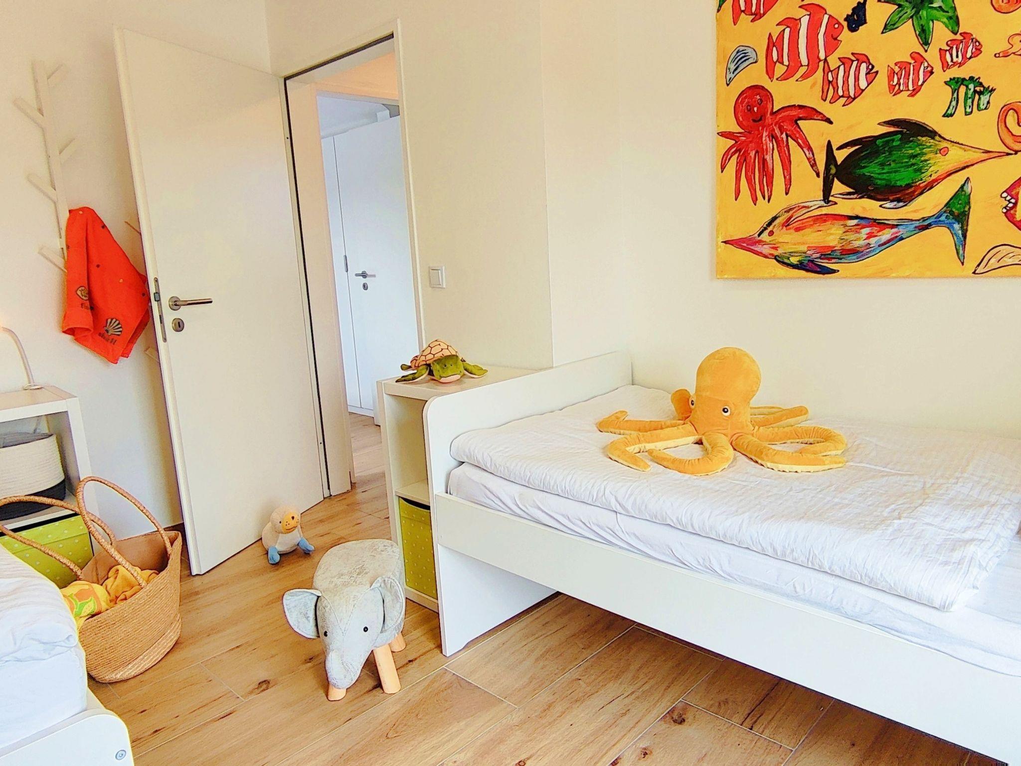 Im Obergeschoss empfangen Sie zwei Schlafzimmer. Das Eltern-Schlafzimmer mit Doppelbett (180 x 200 cm) und kappbarem Babybett sowie dem Kinder-Schlafzimmer mit zwei Einzelbetten (90 x 200cm und 90 x 190cm). Ein Badezimmer mit Badewanne, Toilette und Waschmaschine.