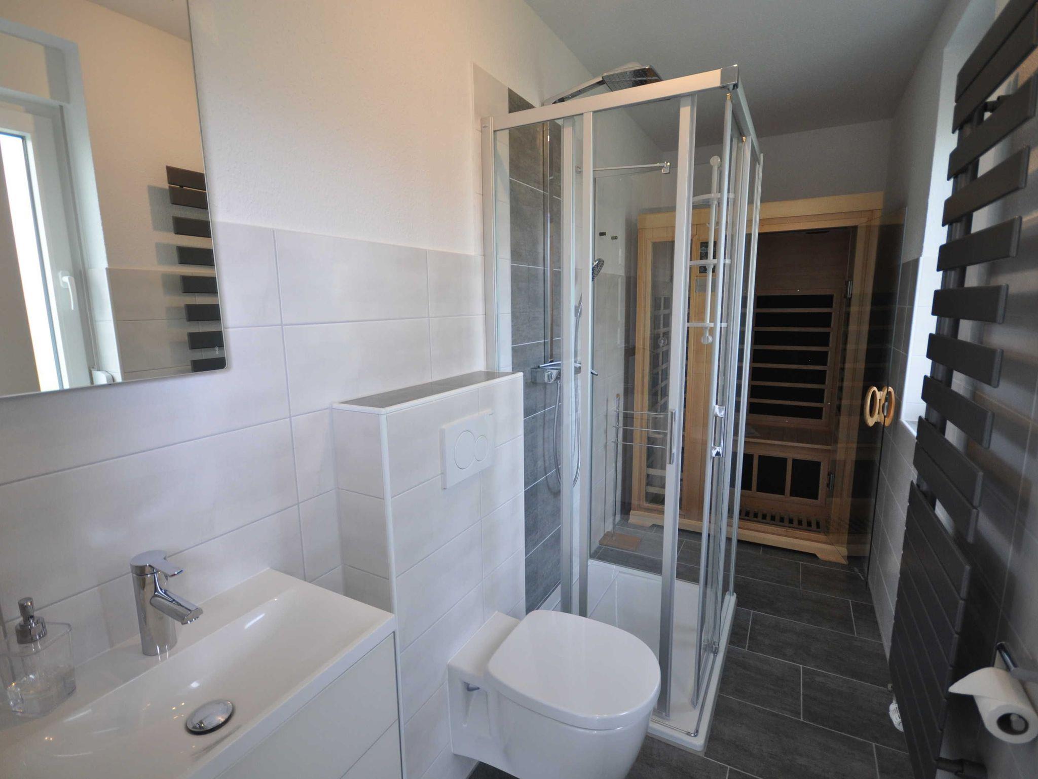 Dieses Ferienhaus bietet bis zu 4 Personen und einem Baby/Kleinkind ausreichend Platz und lässt keine Wünsche offen. Im Erdgeschoss der 2017 neu errichteten, ca. 80m² großen Doppelhaushälfte befindet sich ein großzügiger, moderner Bereich für Kochen, Essen und Wohnen, ein Badezimmer mit bodengleicher Dusche und Infrarot-Wärmekabine. Im Obergeschoss sind 2 Schlafzimmer (1 Doppelbett, 2 Einzelbetten) und ein 2. großzügiges Bad mit Badewanne, bodengleicher Dusche, sowie einem Bidet zu finden. Alle Fenster sind mit Rollläden, die Böden mit Fliesen bzw. Laminat ausgestattet. Zudem sind Fliegengitter an den Schlafzimmerfenstern installiert. WLAN steht Ihnen kostenlos zur Verfügung.