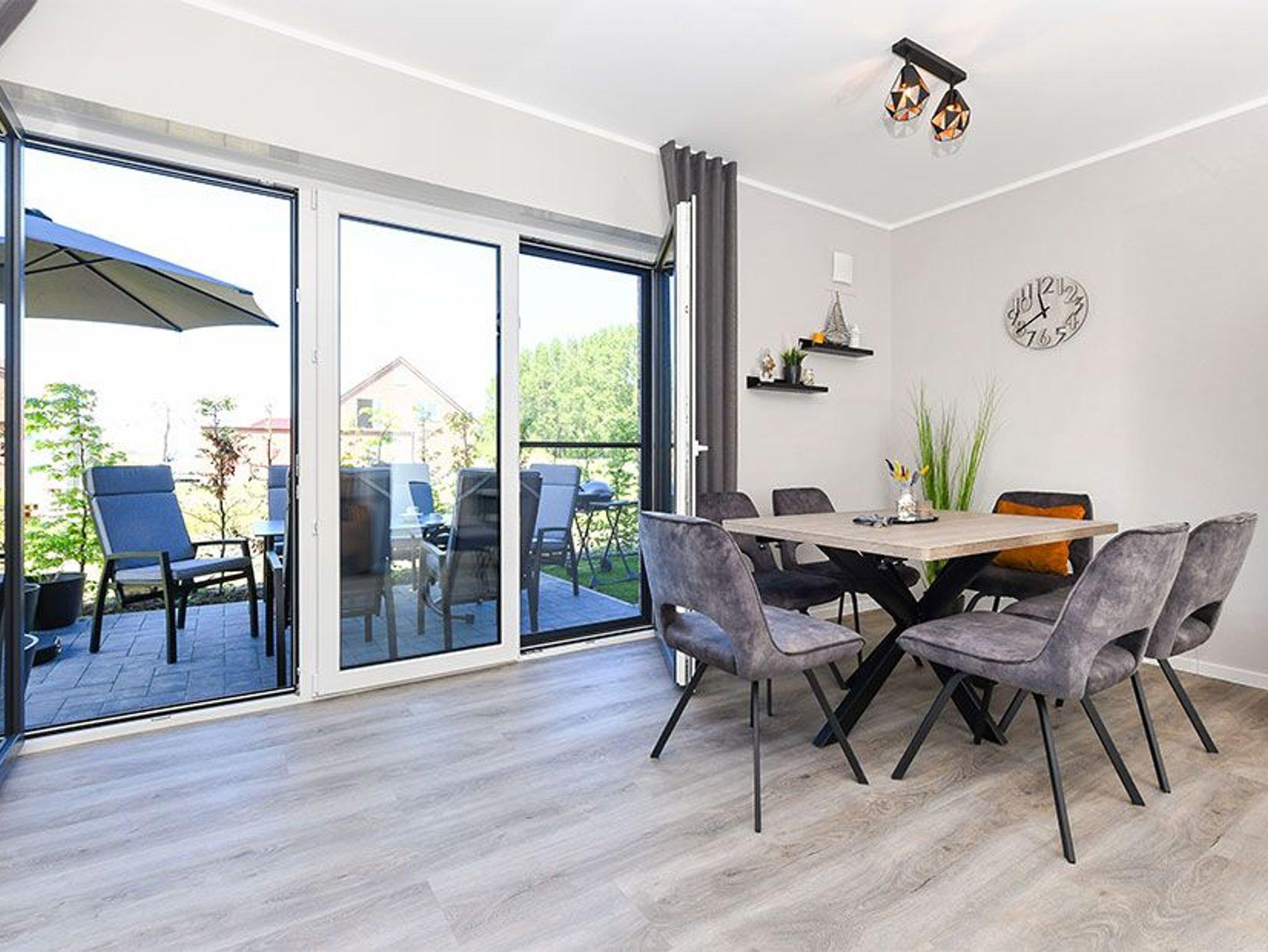 Größe ca. 85 Quadratmeter, Wohnzimmer mit integrierter Küche, Schlafzimmer, zweites separates Schlafzimmer/Kinderzimmer, drittes separates Schlafzimmer, Badezimmer mit Doppel-Waschbecken, Dusche und WC, separates zweites WC mit Waschtisch, Erdgeschoss, Terrasse, Koffer-/Abstellraum, optimal für 2 bis 6 Personen.