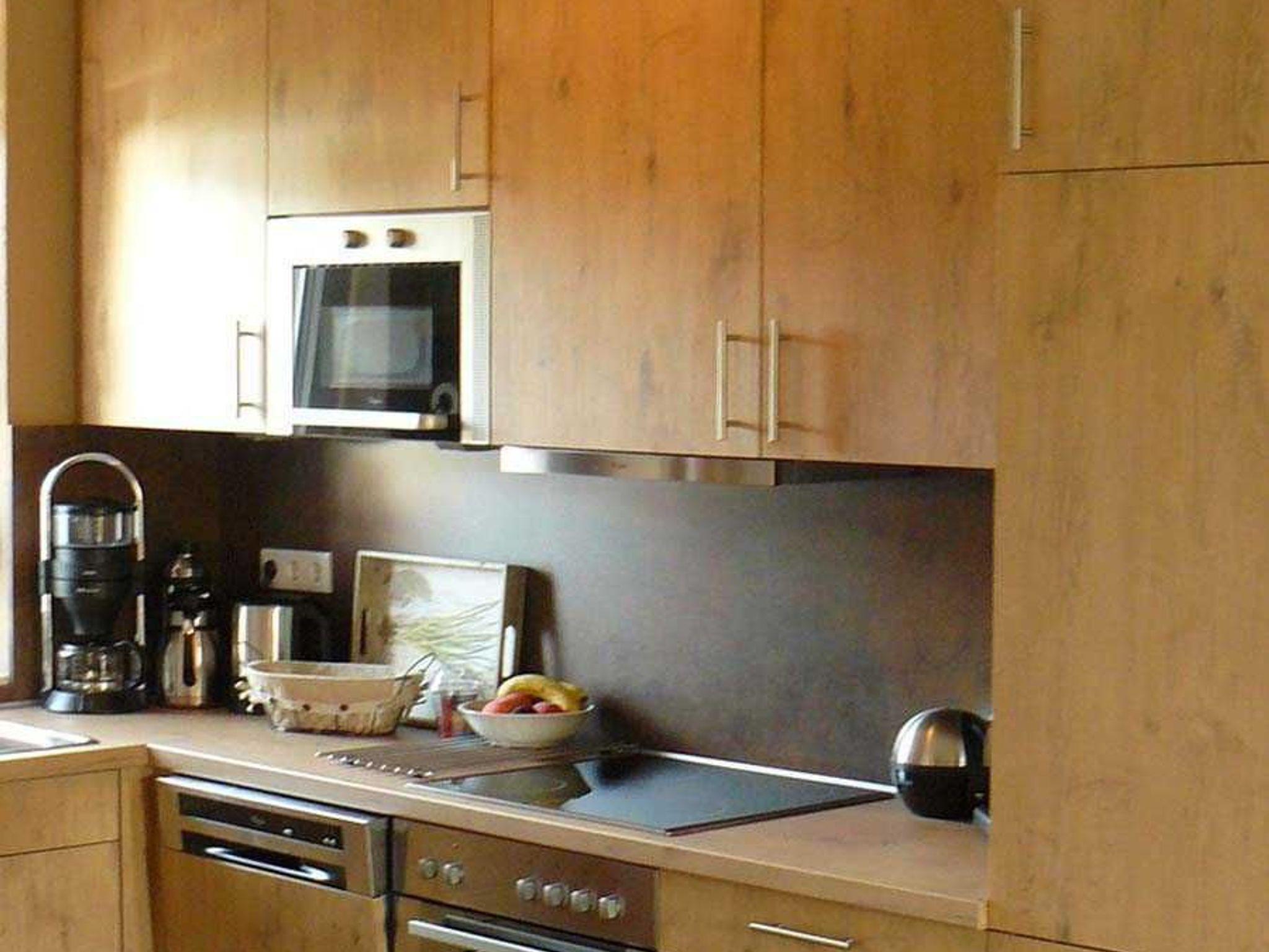 Küche mit Vollausstattung: Geschirrspüler, Ceran-Feld, Backofen, Dunstabzugshaube, Mikrowelle, großer Kühlschrank mit Gefrierfach, Kaffeemaschine, Senseo-Automat, Wasserkocher, Mixer, Eierkocher.