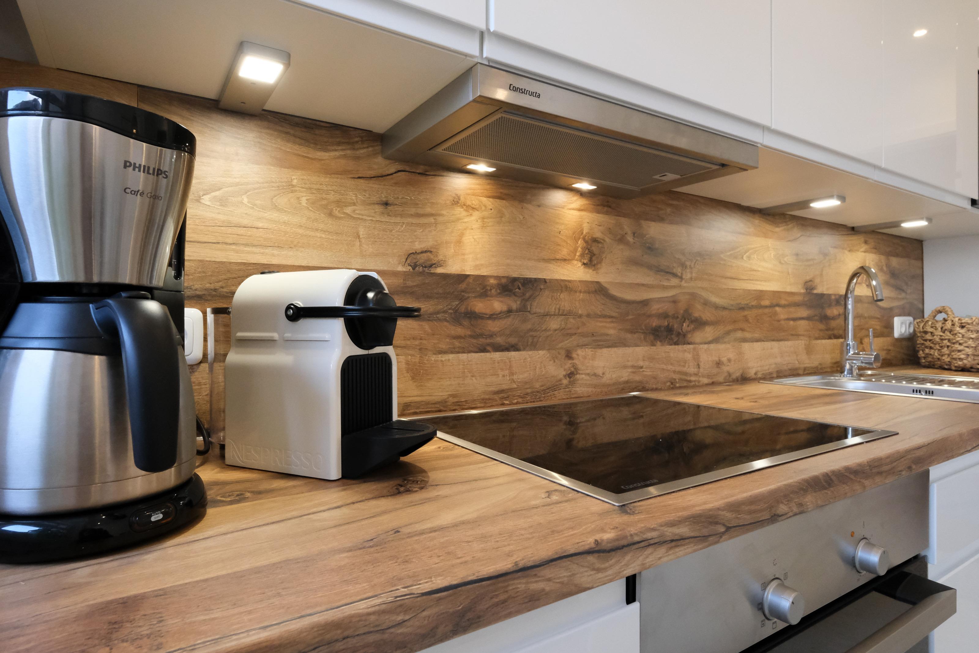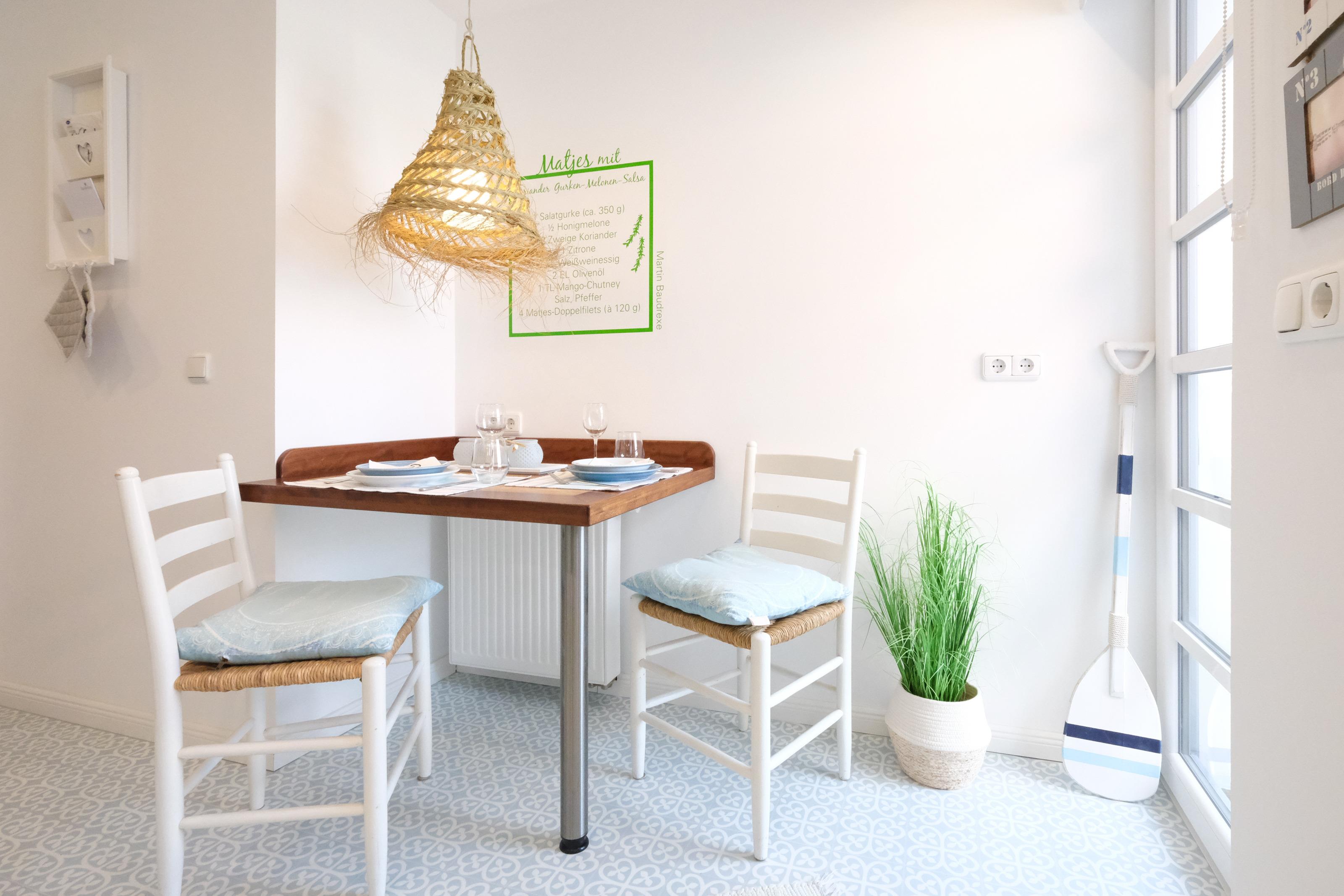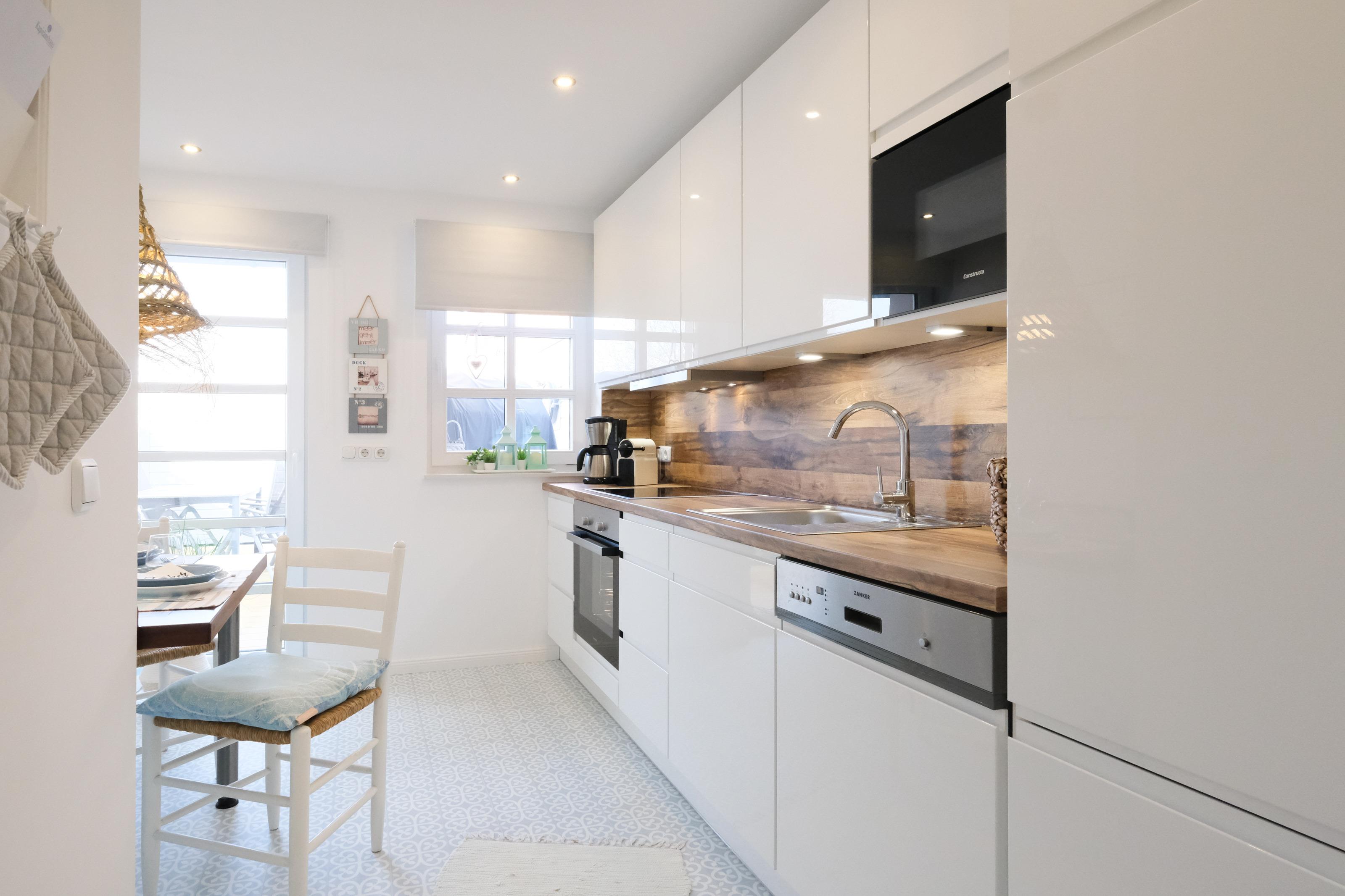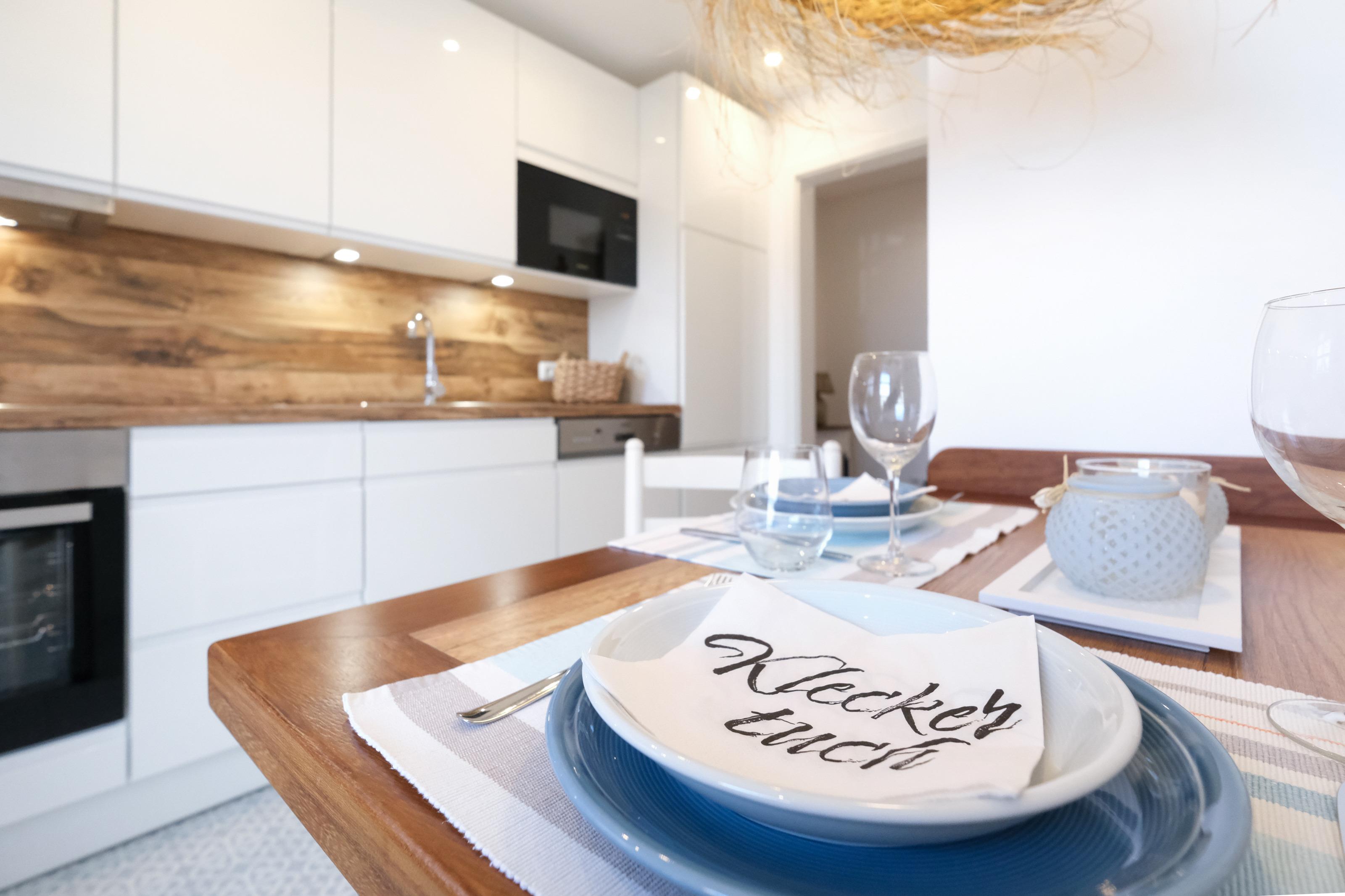 Die Küche im Kapitänshaus ist voll ausgestattet und hält neben Geschirr, Besteck und zahlreichen Geräten wie Toaster, Eierkocher, Kaffeemaschinen (Filter & Kapsel), Mikrowelle auch eine Grundversorgung an Kaffee, Tee und Gewürzen für Sie bereit. Eine komplett neue Küche wird im Herbst 2022 montiert.