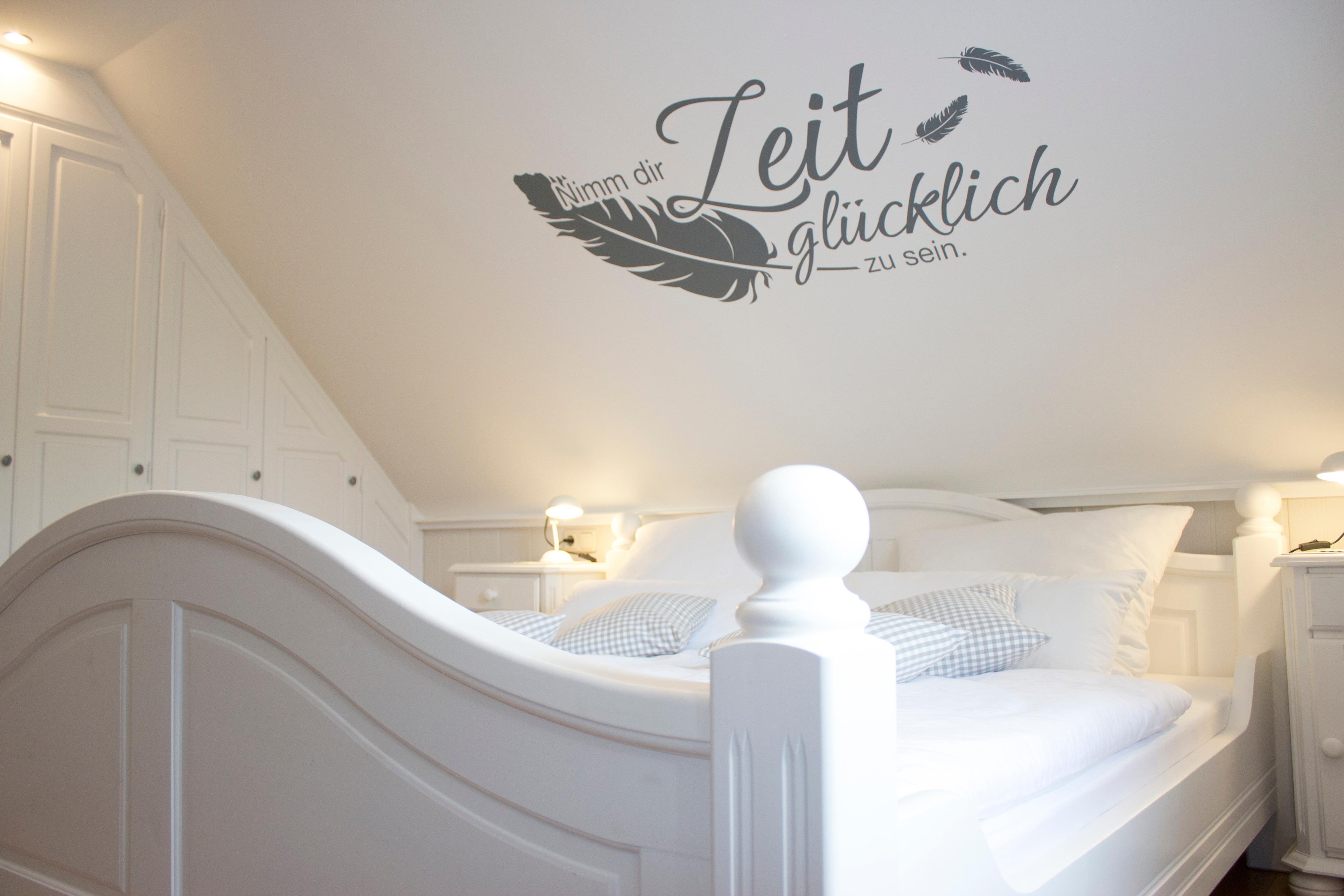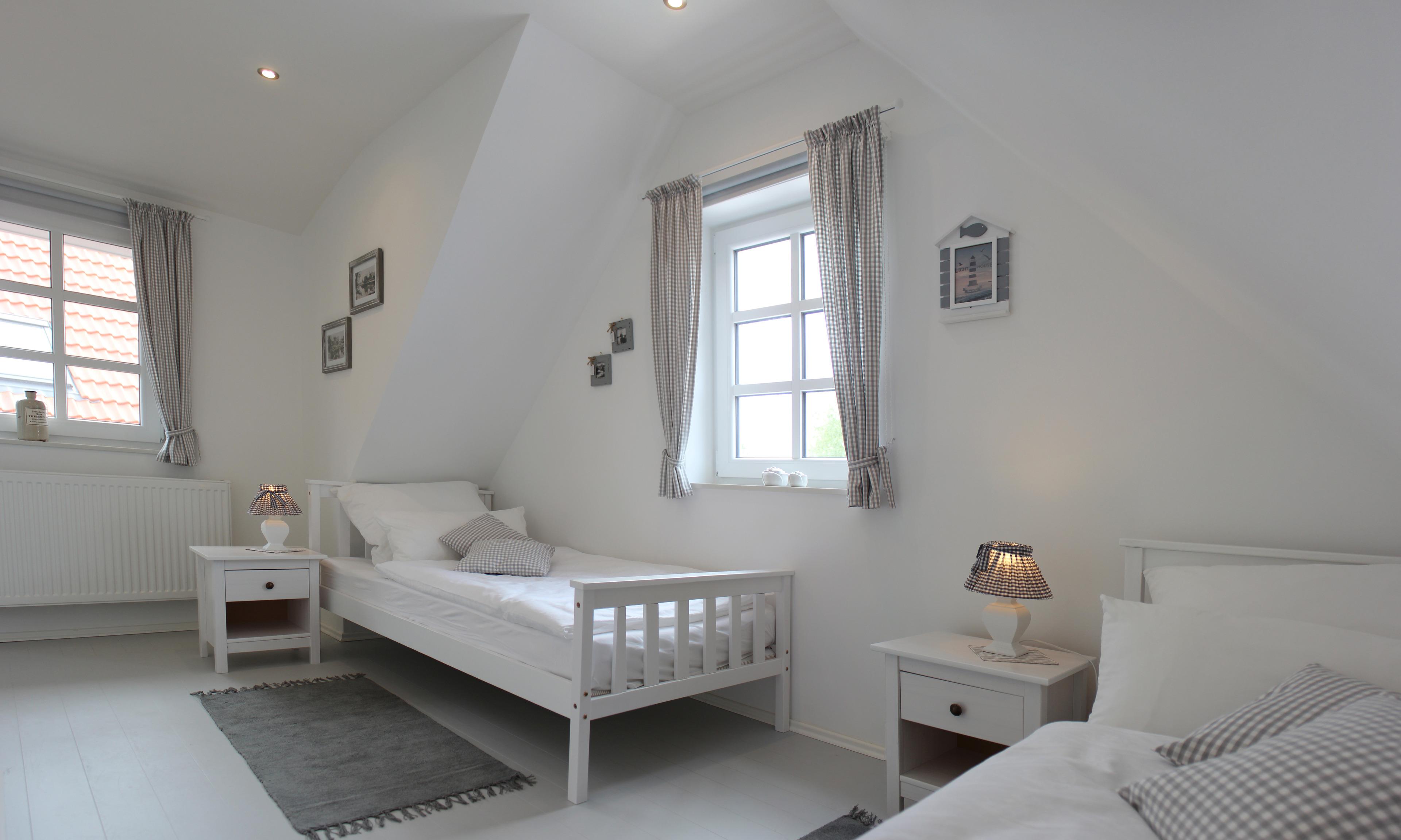 Im gut isolierten Obergeschoss befinden sich zwei großzügige Schlafzimmer und ein separates WC. Das Elternschlafzimmer mit Echtholzparkett und Blick auf die Harle verfügt über ein komfortables Doppelbett, ein Babybett und viel Stauraum im maßgefertigten Kleiderschrank. Das zweite Schlafzimmer ist mit Twin-Betten und einem TV ausgestattet.