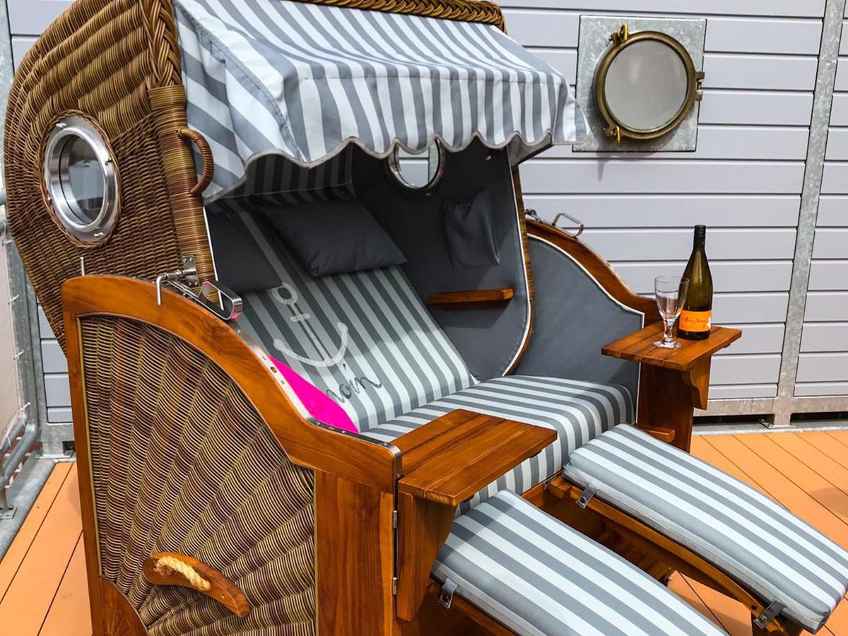 Von der Küche aus gelangen Sie auf die großzügige Terrasse des Kapitänshaus. Ganz gleich ob Sie hier frühstücken, ein Sonnenbad auf der Liege genießen, oder bei einem Glas Wein den Sonnenuntergang vom Strandkorb aus beobachten. Hier finden Sie einen Ort, um einfach mal die Seele baumeln zu lassen.