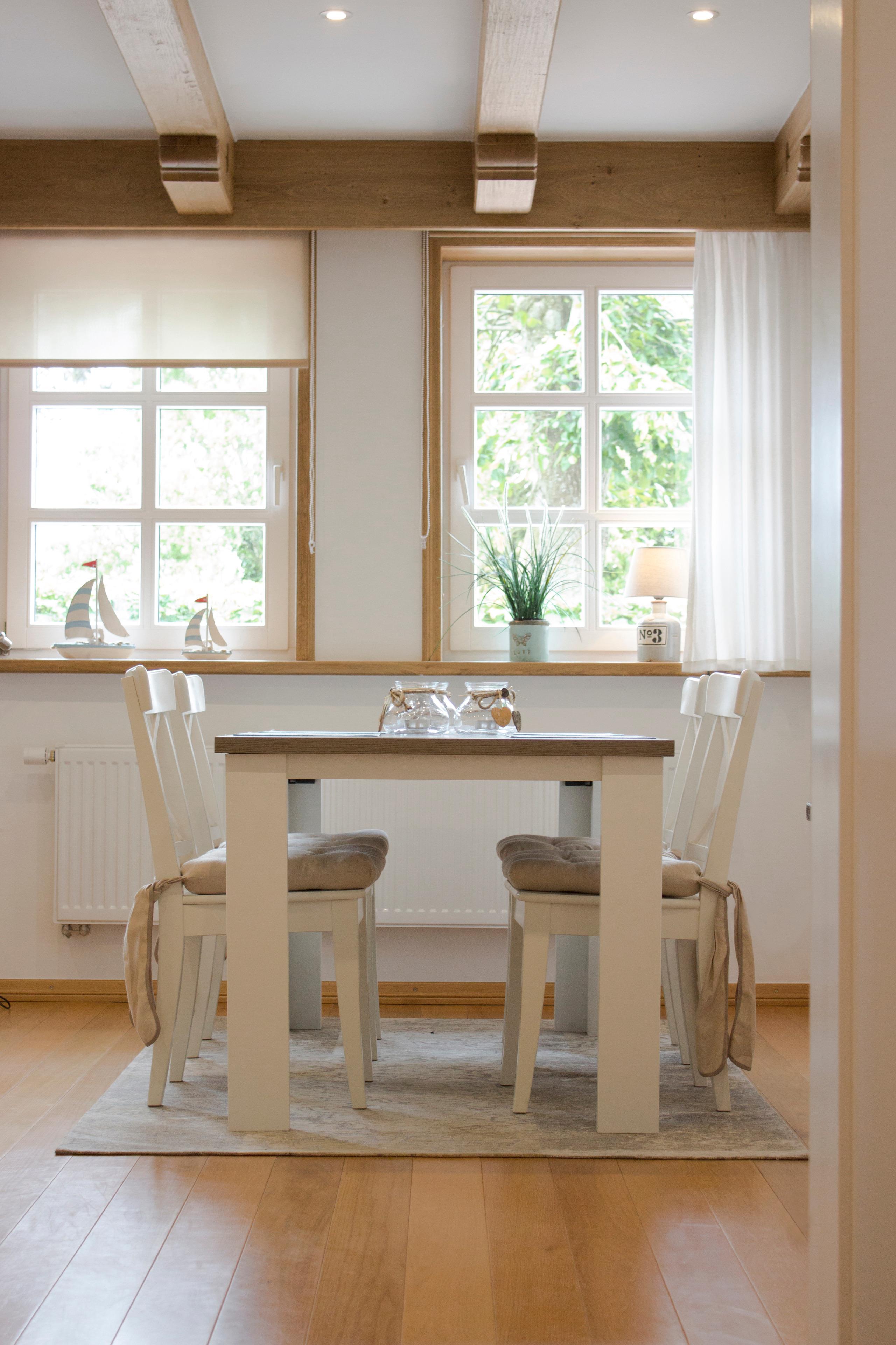 Der Wohnbereich ist mit Echtholzparkett ausgestattet und verfügt über eine gemütliche Couchecke mit Flachbild TV, weiße Landhausmöbel, einen Essbereich für 4 Personen und einen freistehenden Kamin.