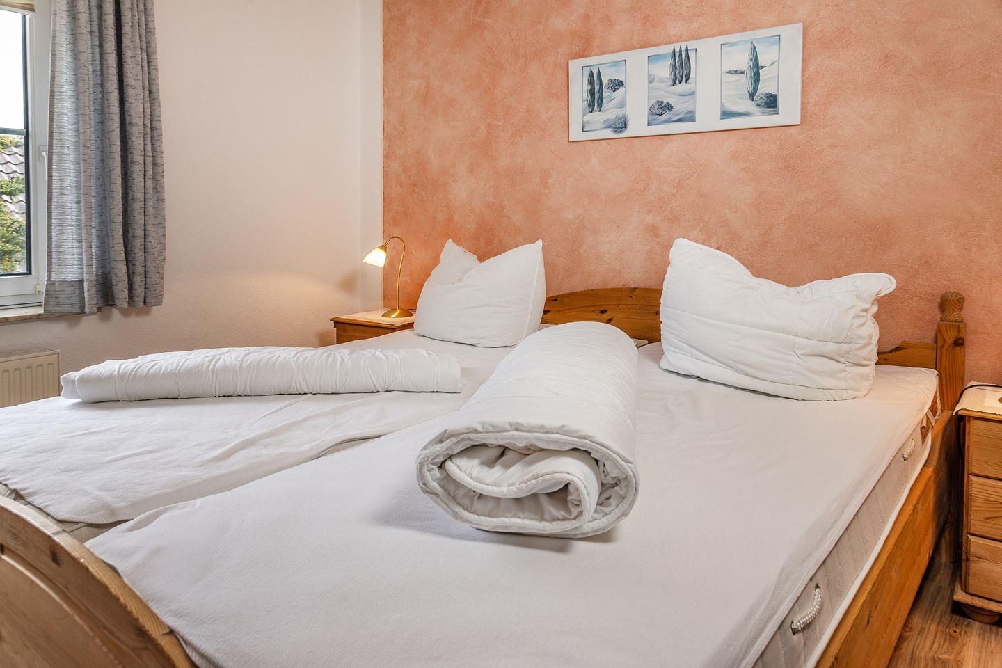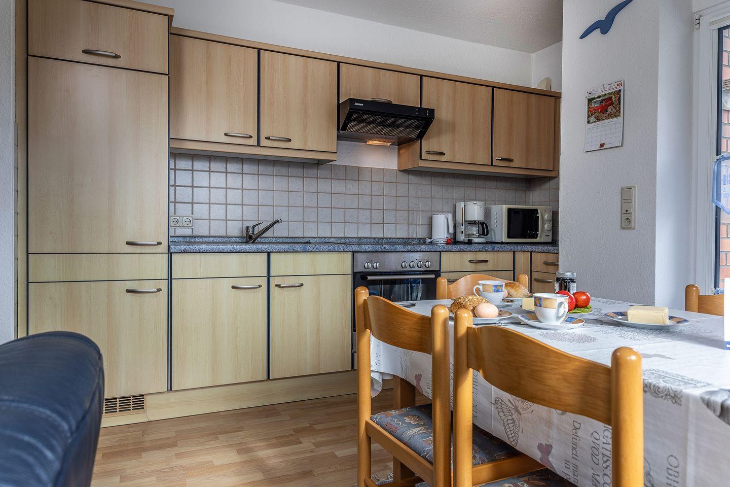 Helle, maritime Ferienwohnung im 1. Obergeschoss mit echtem Nordseecharme. Sie verfügt über einen Wohnraum mit Essbereich, Küchenzeile und einem Süd-Ost-Balkon, Badezimmer mit Dusche sowie drei Schlafzimmern: ein Schlafzimmer mit Doppelbett, ein weiteres Schlafzimmer mit einem Einzelbett. Zusätzlich im ausgebauten Dachstudio erwartet Sie ein gemütlicher Rückzugsort mit einem weiteres Bett (1,20m), einer kleine Sitzecke und TV.