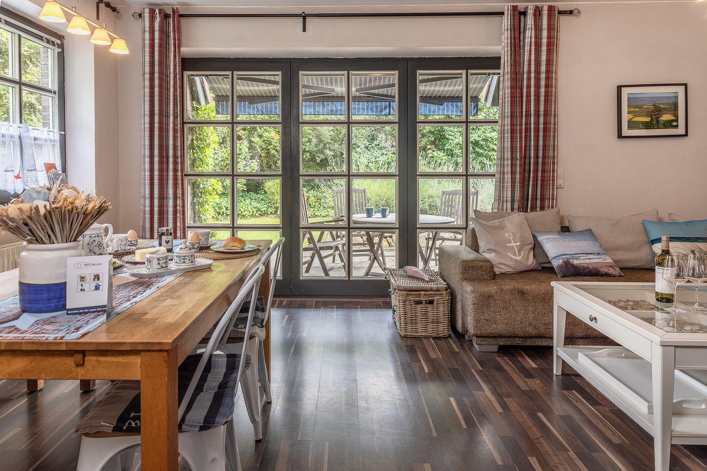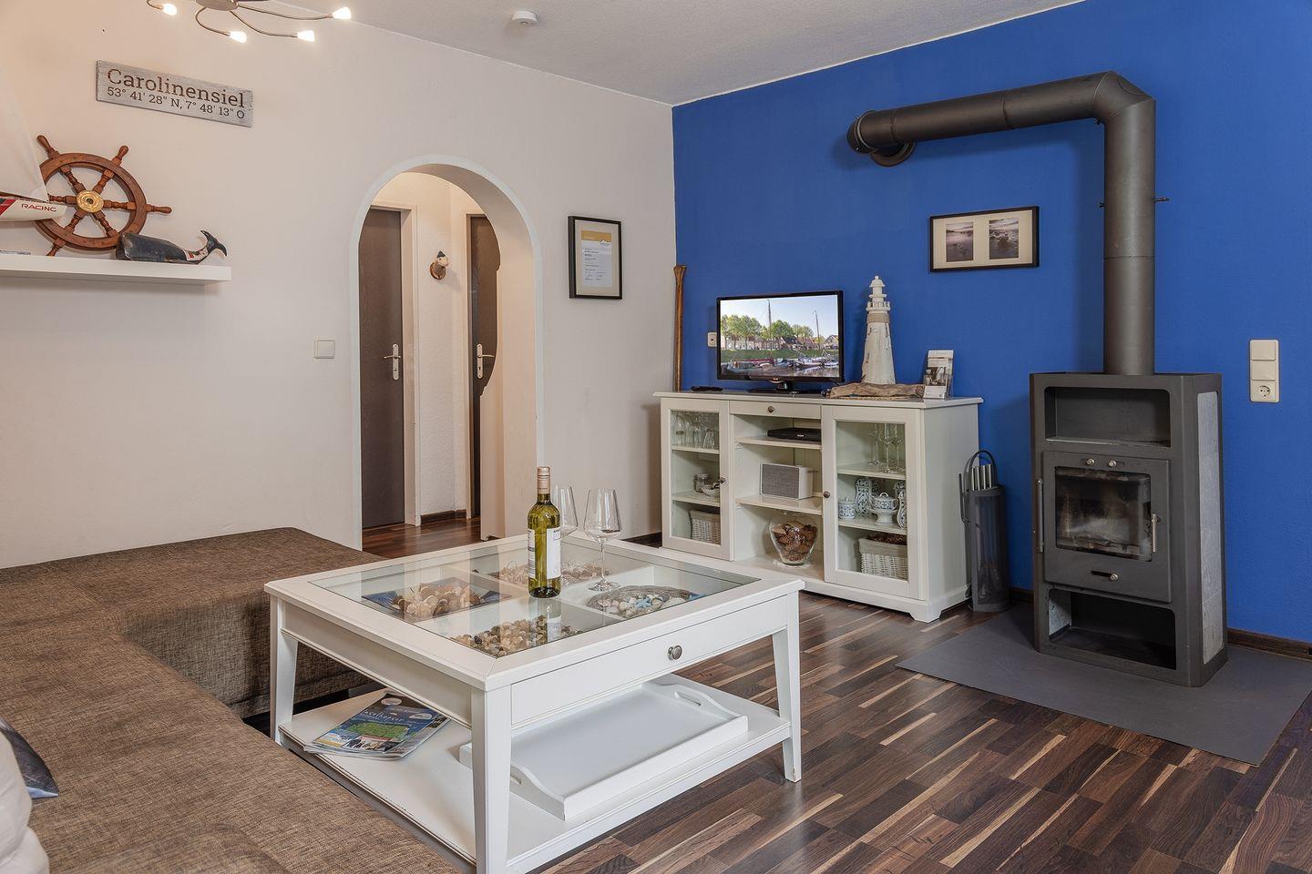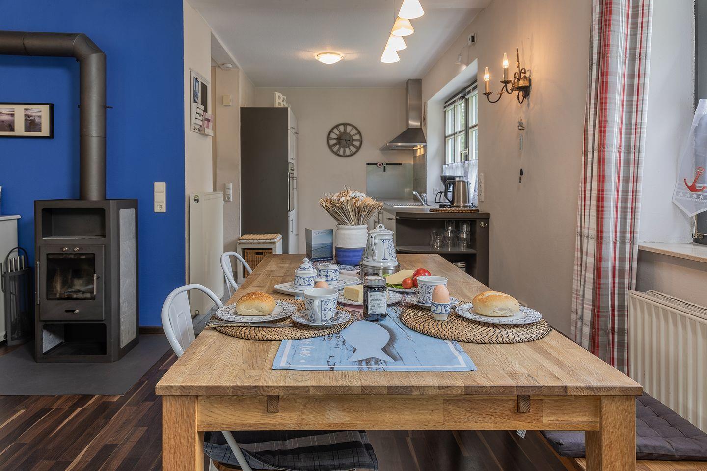 Großer Wohn-/Essbereich mit Kaminofen, Sat-TV, Stereoanlage, Essplatz mit Sitzbank und Stühlen.