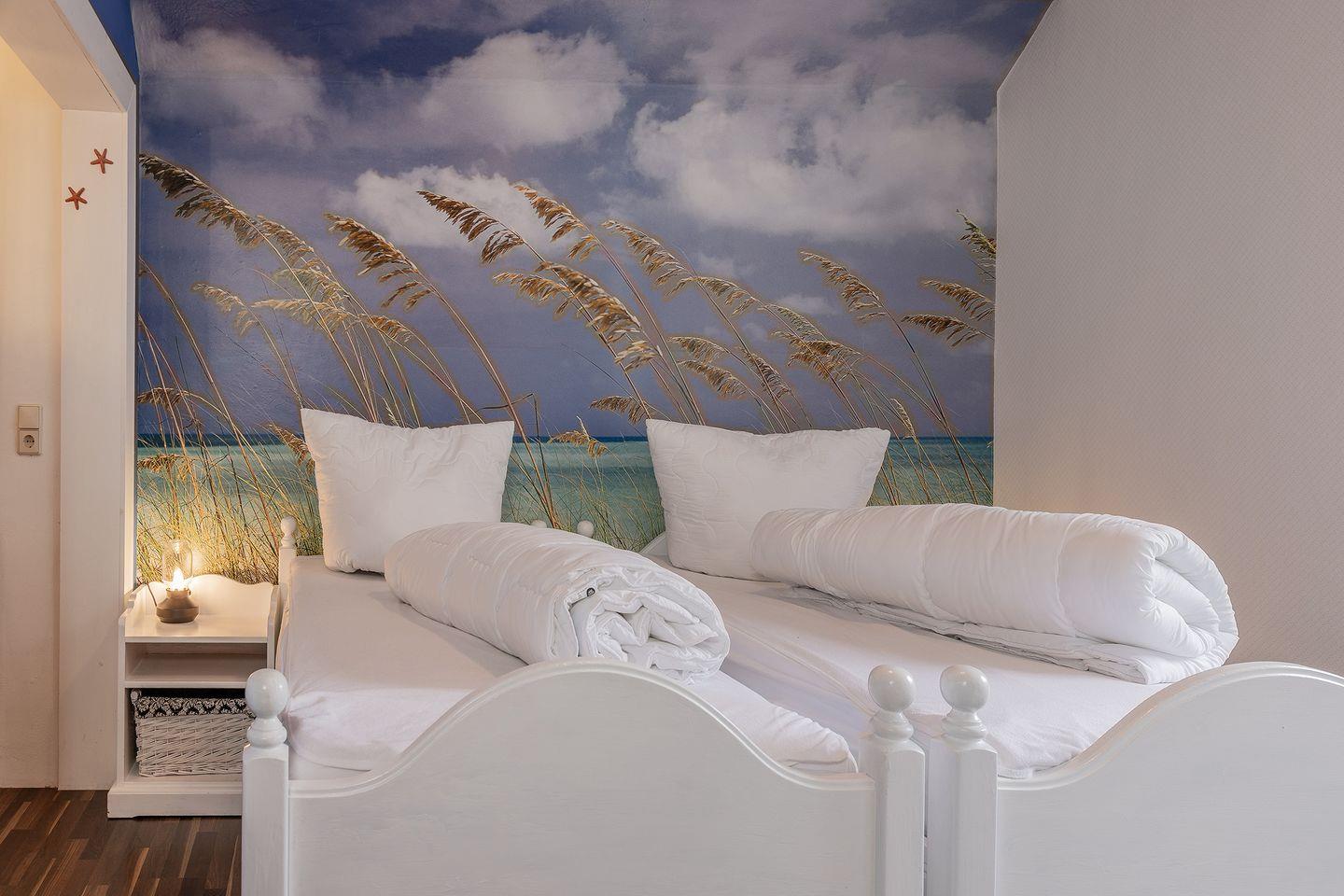 1 Schlafzimmer mit Doppelbett in Komforthöhe und feststehendem Kinderbett(in einer Nische)