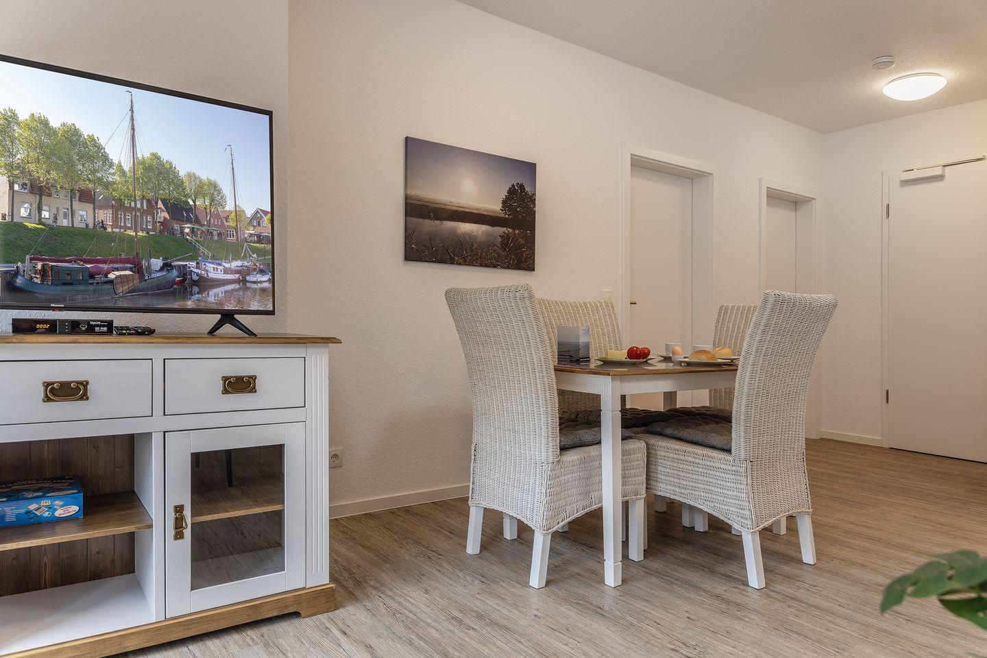 Genießen Sie erholsame Tage in dieser komfortablen, lichtdurchfluteten und modernen Ferienwohnung. Starten Sie den Urlaubstag mit einer erfrischenden Dusche. Egal wie viele Personen mit Ihnen gereist sind, aufgrund der räumlichen Trennung von WC und Dusche wird es keinen morgendlichen Stau bei den Sanitäranlagen geben. Frühstücken Sie gemütlich im offenen Wohn-Küchenbereich oder auf der Doppelterrasse. Beginnen Sie den Tag ohne großen Aufwand, denn absolut alles Wichtige (Museumshafen, Raddampfer, Ärzte, Restaurants, Cafés, Einkaufsmöglichkeiten, Physiotherapie, Spielplätze, Sielhafenmuseum, Textilläden, Bank, Friseur, Eisdielen…) finden Sie in unmittelbarer Nähe oder unter 300 Meter Fußweg. Nachdem Sie die Umgebung erkundet, die Inseln besucht, am Strand entspannt, das Museum erforscht oder eine Fahrradtour gemacht haben, stärken Sie sich entweder in einem der naheliegenden Restaurants oder in der gut ausgestatteten Küche. Lassen Sie den Tag nun ausklingen bei einem schönen Film oder Buch auf dem Sofa oder bei einem Gläschen auf der Terrasse.