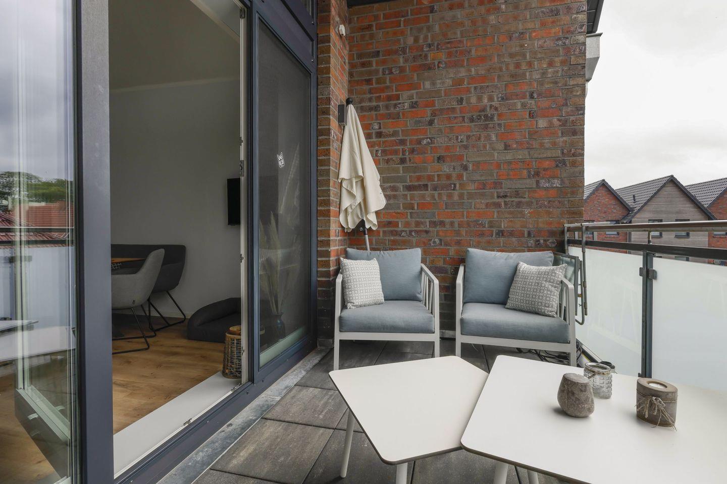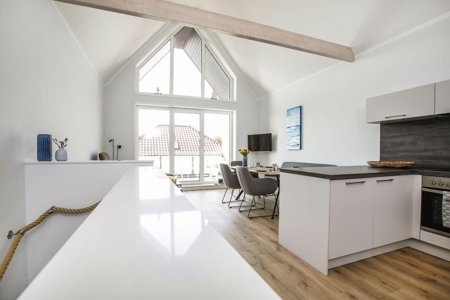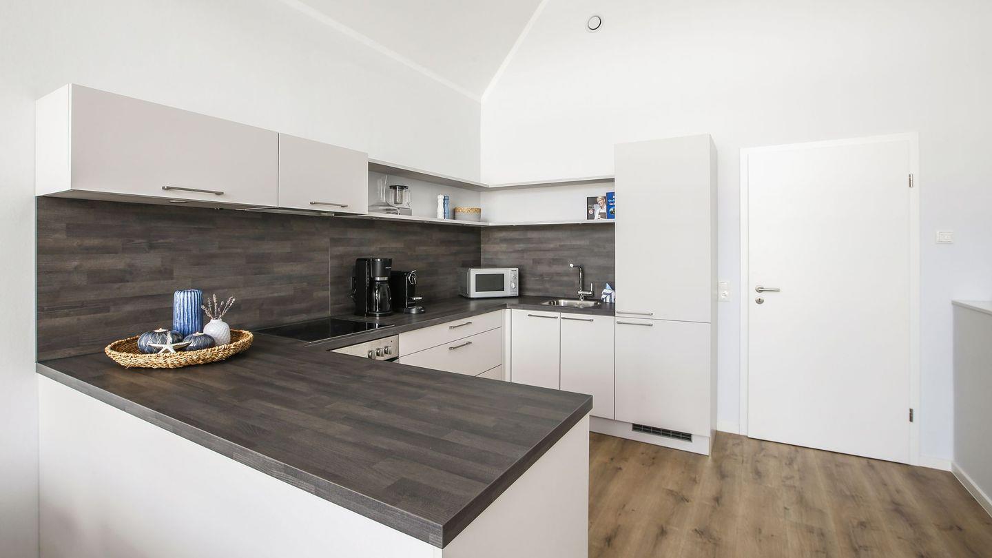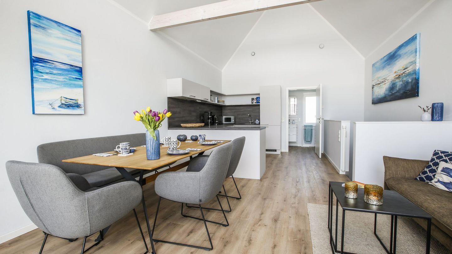 Das Herzstück des Hauses ist der offene Wohnbereich, der mit einer modernen Küche und einem Essbereich ausgestattet ist. Die Küche lässt kaum Wünsche offen und ist mit einem Herd, einem Backofen, einer Mikrowelle, einer Spülmaschine und zahlreichen Küchenutensilien ausgestattet. Genießen Sie Ihre Mahlzeiten am Esstisch oder auf der überdachten Terrasse, die sich perfekt für entspannte Frühstücke im Freien eignet. Der Garten ist ebenfalls mit Gartenmöbeln und einem Sonnenschirm ausgestattet, sodass Sie die frische Nordseeluft in vollen Zügen genießen können.