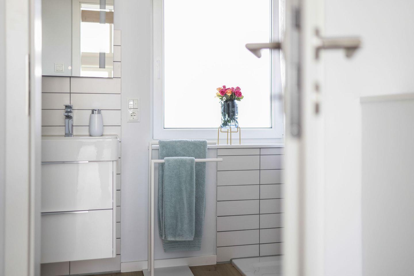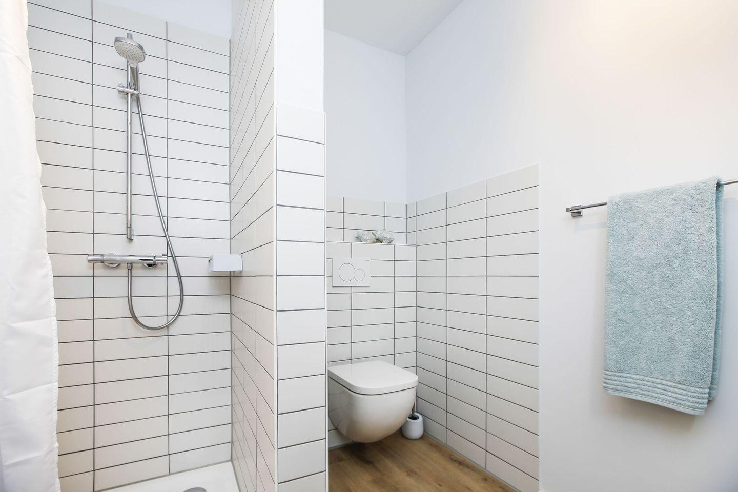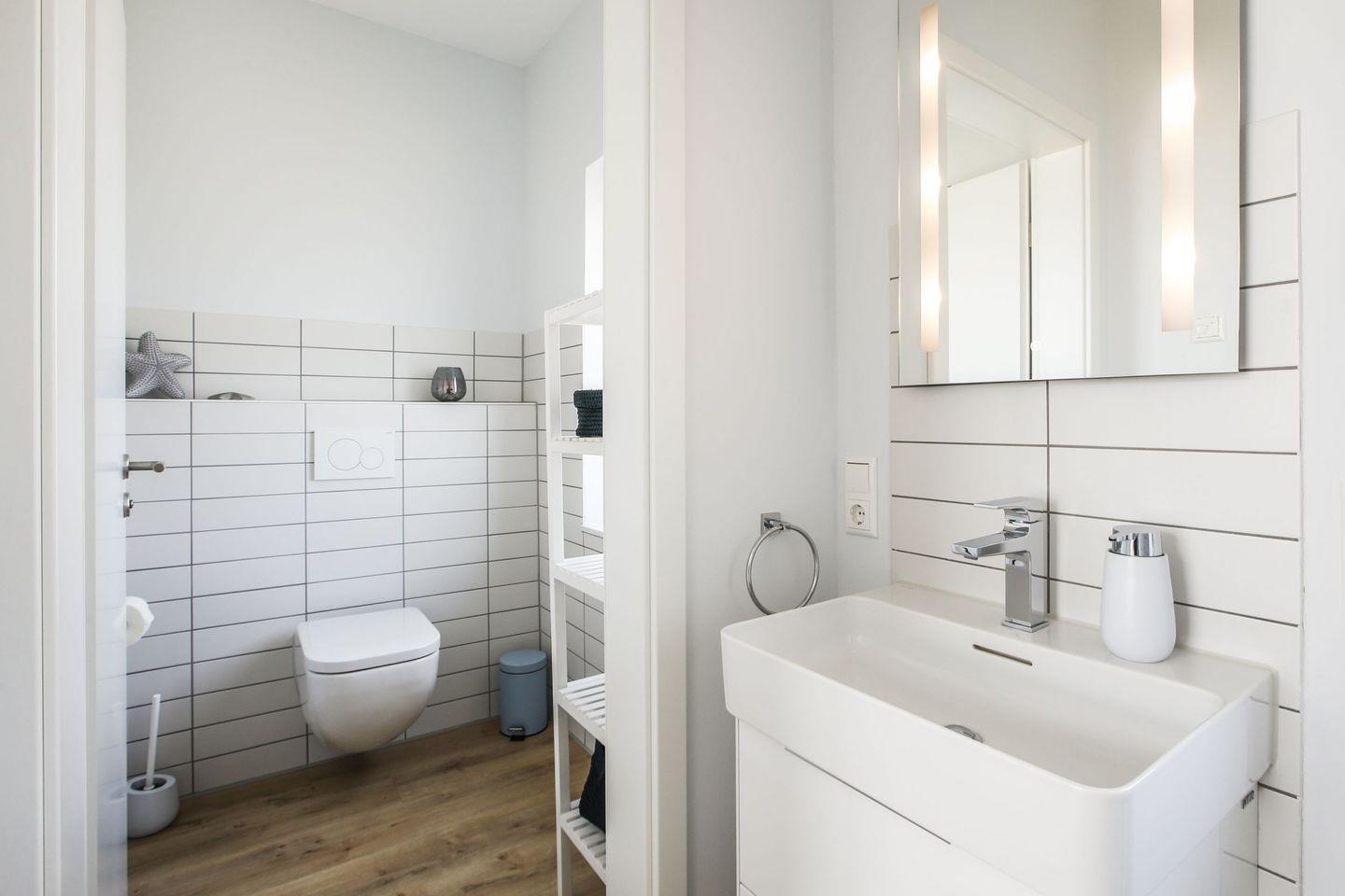 Das Ferienhaus Küstenglück Rosalie bietet zudem zwei stilvolle Badezimmer, ausgestattet mit bodengleichen Duschen, Waschbecken und WCs – so kann sich die ganze Familie bequem frisch machen. Auch Annehmlichkeiten wie Handtücher, Bettwäsche und ein Wäscheservice gehören zu den technischen Details, die Ihnen zur Verfügung stehen.