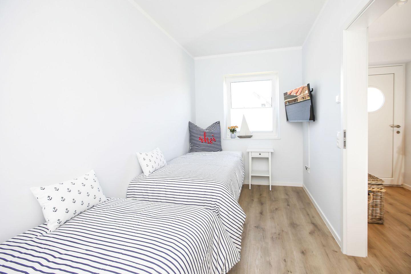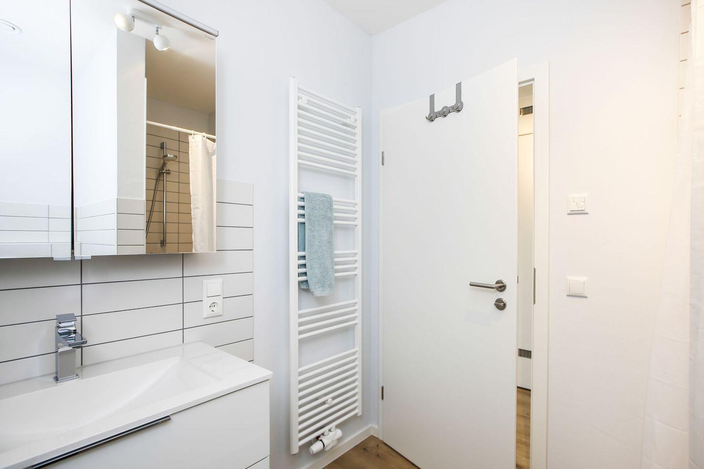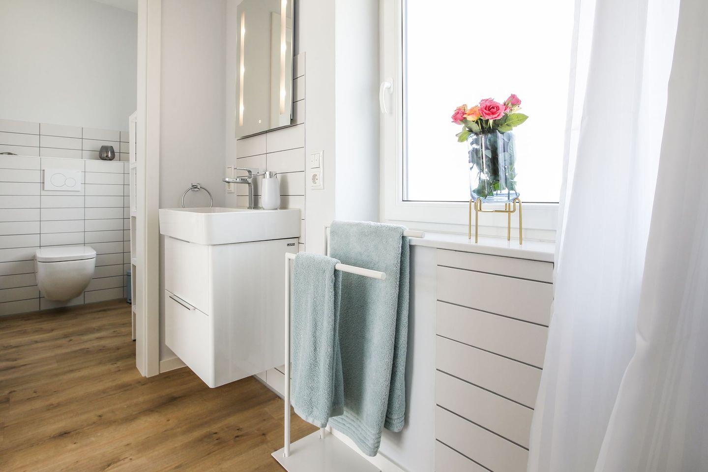 Das Ferienhaus Küstenglück Rosalie bietet zudem zwei stilvolle Badezimmer, ausgestattet mit bodengleichen Duschen, Waschbecken und WCs – so kann sich die ganze Familie bequem frisch machen. Auch Annehmlichkeiten wie Handtücher, Bettwäsche und ein Wäscheservice gehören zu den technischen Details, die Ihnen zur Verfügung stehen.