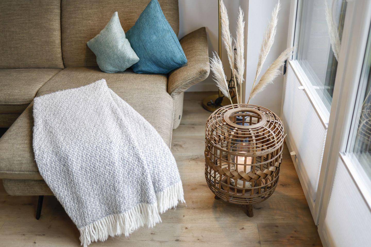 Die Unterkunft verfügt über zwei separate Schlafzimmer, die mit Vinylboden ausgestattet sind und über eine angenehme Fußbodenheizung verfügen. Hier können Sie in ruhiger Atmosphäre entspannen und nächtigen. Das moderne Wohnzimmer mit überdachter Terrasse lädt mit einer komfortablen Sofaecke und einem Esstisch zu geselligen Spielen oder entspannten Filmabenden ein. Ausgestattet mit drei Fernsehern, darunter ein 44 bis 55 Zoll großes Modell, sowie einem CD-Player und Radio, sind Sie auch für Unterhaltung bestens beraten.