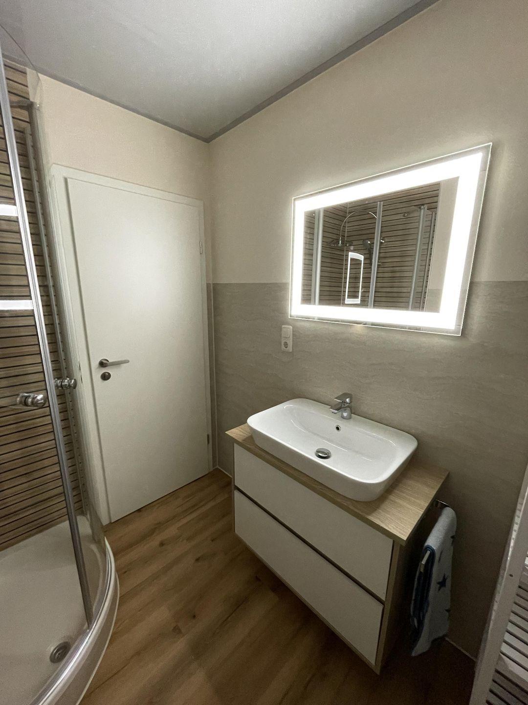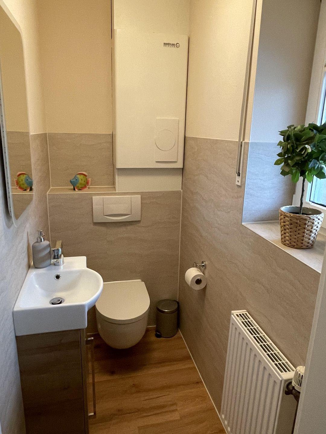 Die Unterkunft verfügt über ein modernes Badezimmer mit Dusche, Waschbecken und WC, sowie einem zusätzlichen Gäste-WC für mehr Komfort. Für Ihren Aufenthalt steht Ihnen auch eine Waschmaschine zur Verfügung, sodass Sie auch längere Aufenthalte ohne Probleme planen können. Die zentrale Heizungsanlage sorgt in der kalten Jahreszeit für eine wohlige Wärme, während die Sichtschutzfenster für Privatsphäre sorgen.