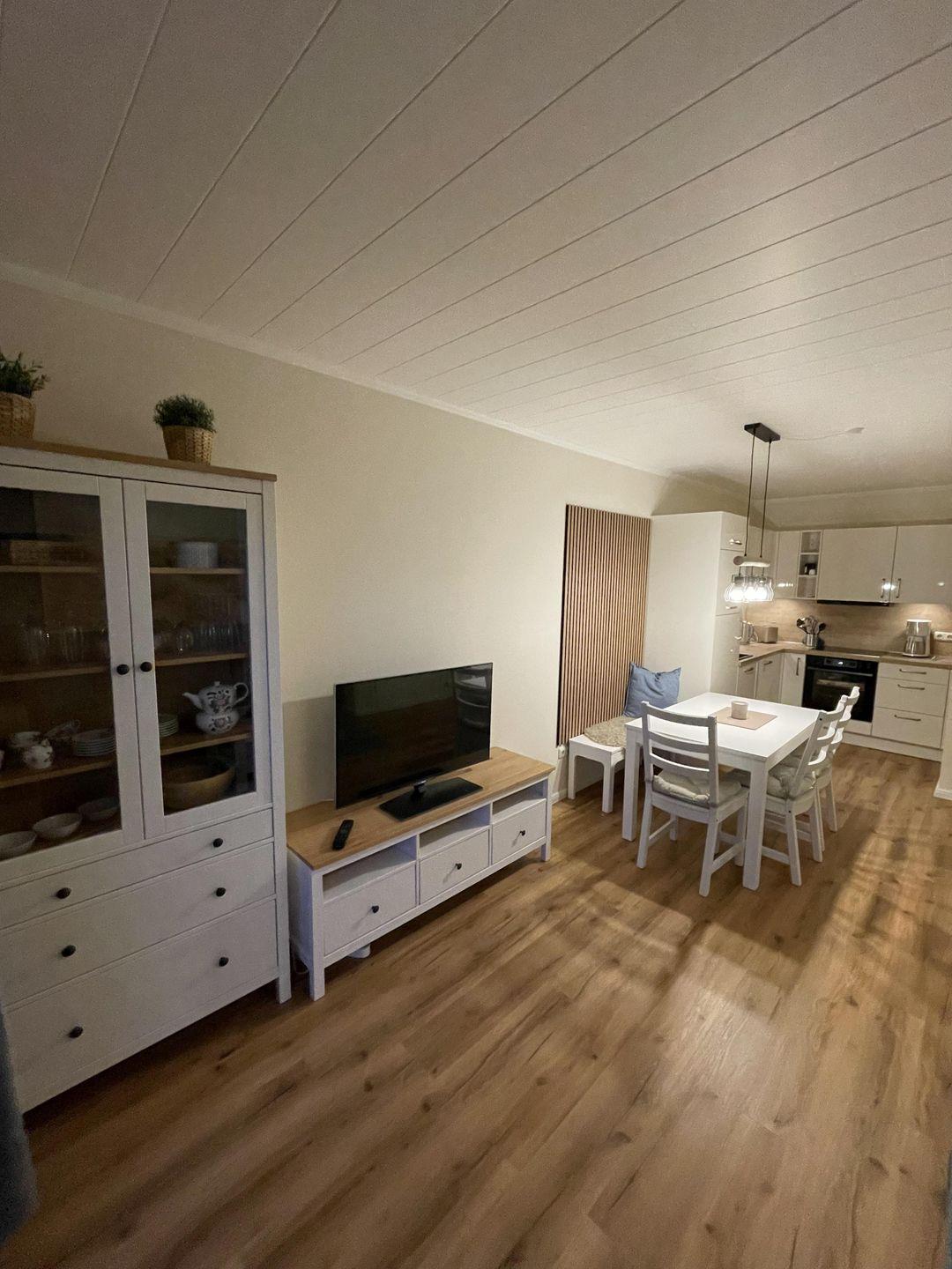 Die Deichstube-Caro ist besonders kinderfreundlich und eignet sich hervorragend für Familien mit bis zu vier Personen. Sie finden hier zwei gemütliche Schlafzimmer, die ideal für erholsame Nächte sind. Zudem stehen Ihnen ein Babybett und ein Kinderhochstuhl zur Verfügung, was die Reise mit Kleinkindern erleichtert. Der offene Ess- und Wohnbereich schafft eine angenehme Atmosphäre zum gemeinsamen Verweilen. Hier können Sie auf dem bequemen Sofa relaxen oder am Esstisch gesellige Spieleabende verbringen. Der Fernseher mit Satellitenanschluss sorgt für Unterhaltung, auch wenn das Wetter einmal nicht mitspielt.