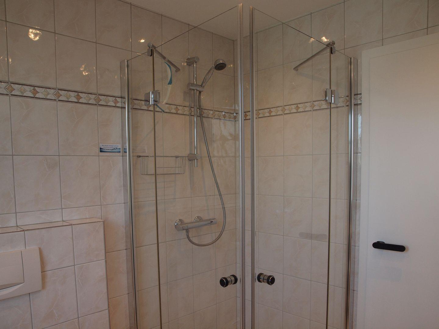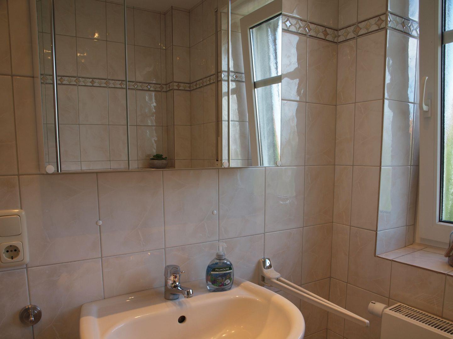 Ebenso befindet sich im Obergeschoss das Badezimmer mit Waschbecken, Spiegelschrank, WC und bodengleicher Dusche.