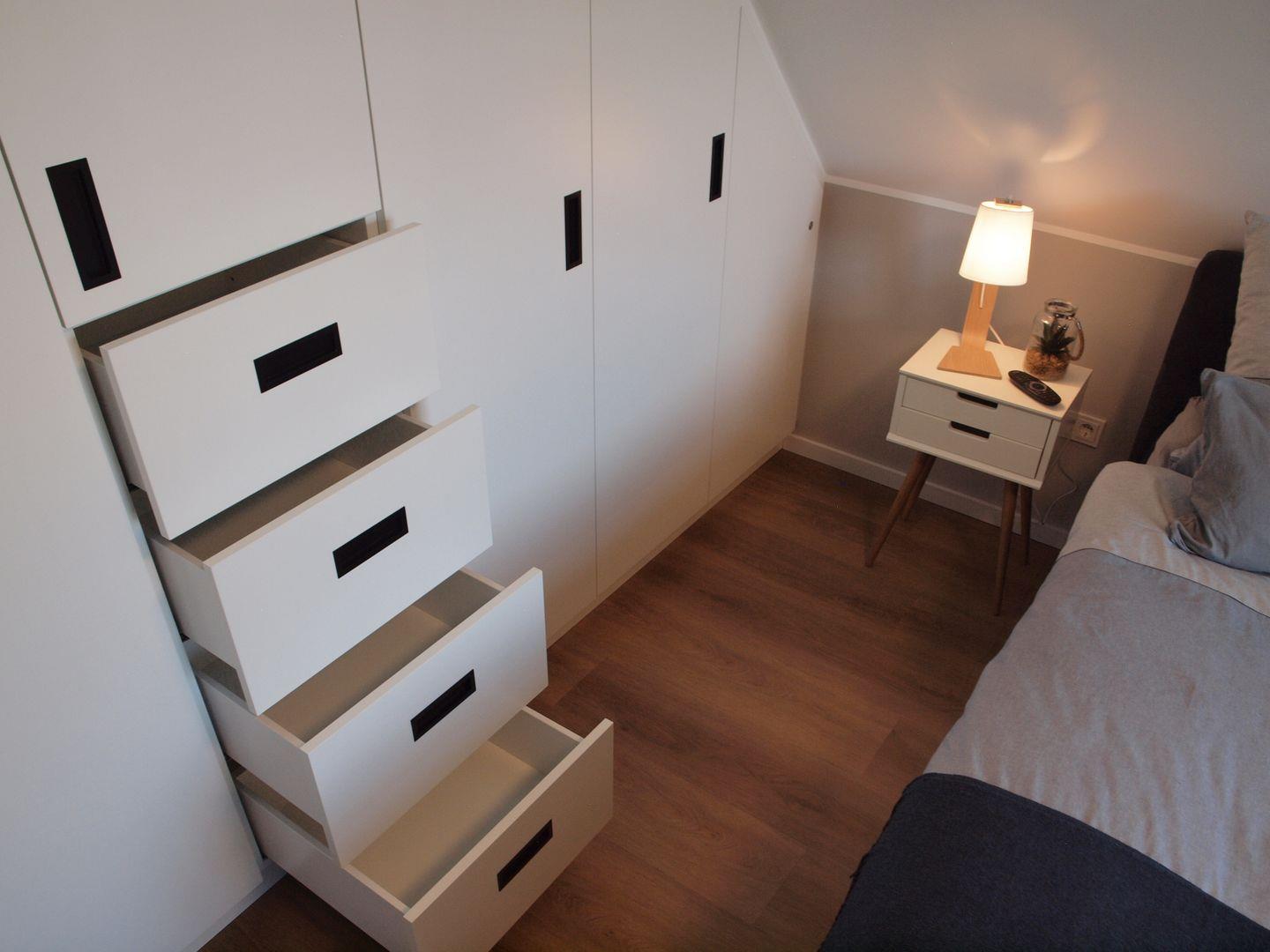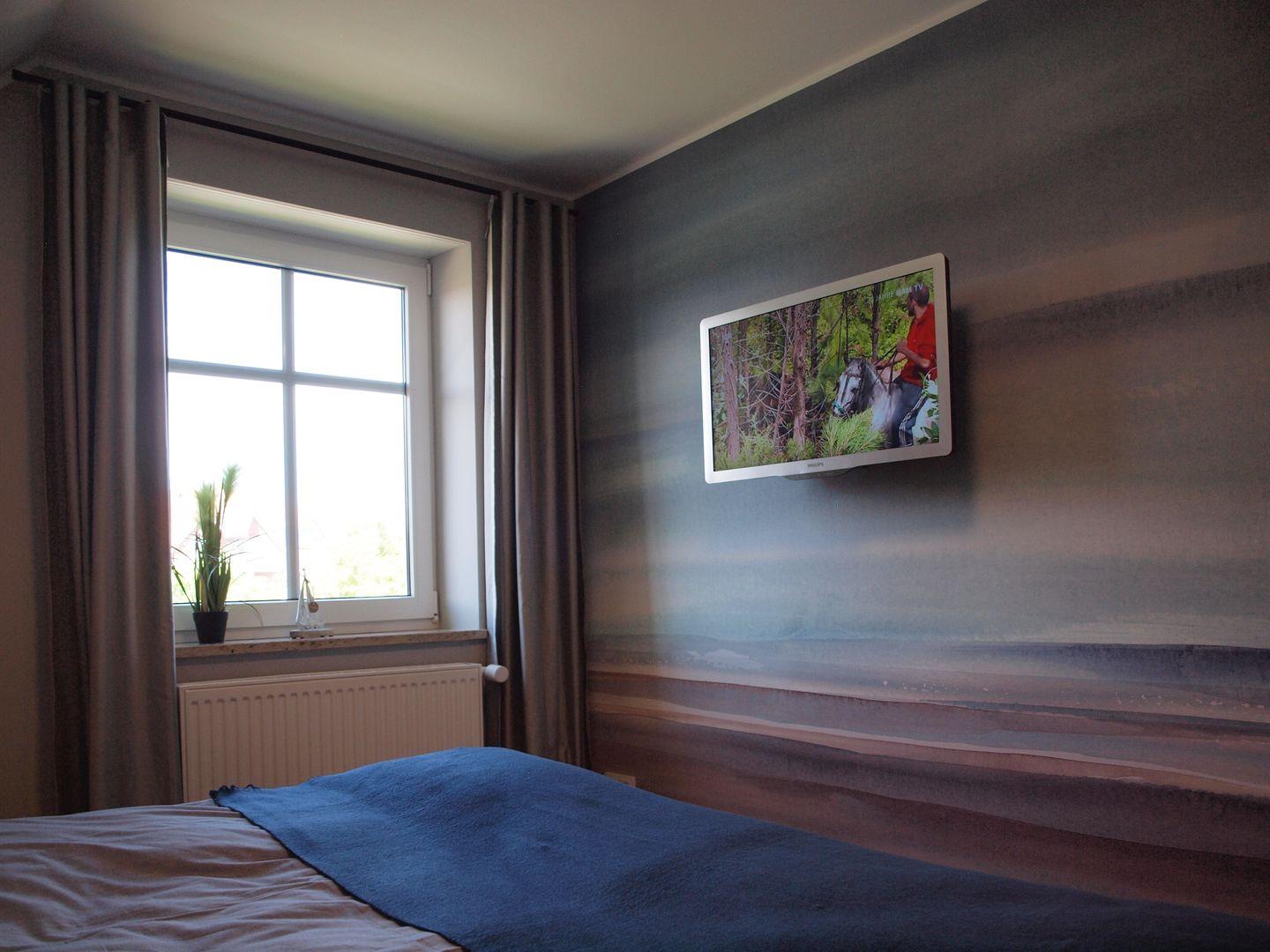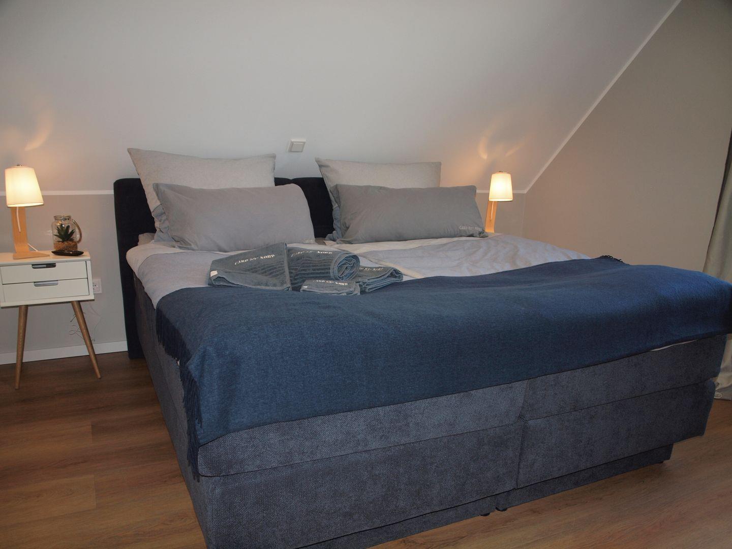 Im Obergeschoss des Hauses sind die beiden Schlafzimmer untergebracht. Im ersten Schlafzimmer befindet sich ein Boxspringbett für zwei Gäste (180 x 200 cm) und ein Kleiderschrank mit ausreichend Platz für Ihre Garderobe. Außerdem, nebst dem Fernseher im Wohnzimmer, ein weiterer Fernseher.