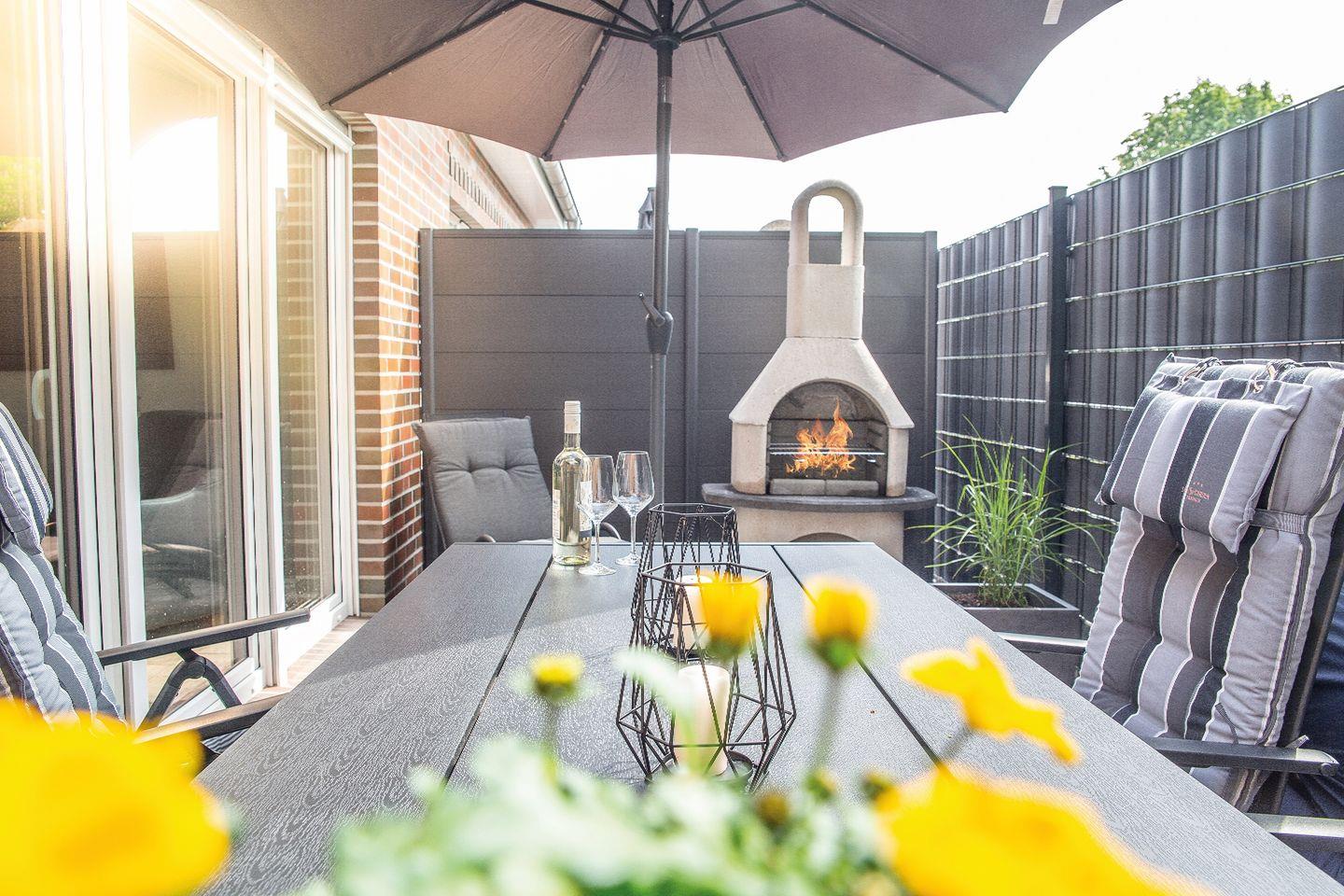 Der Außenbereich des Ferienhauses verfügt über eine möblierte Terrasse in Südausrichtung und lädt zur Erholung ein. Es
