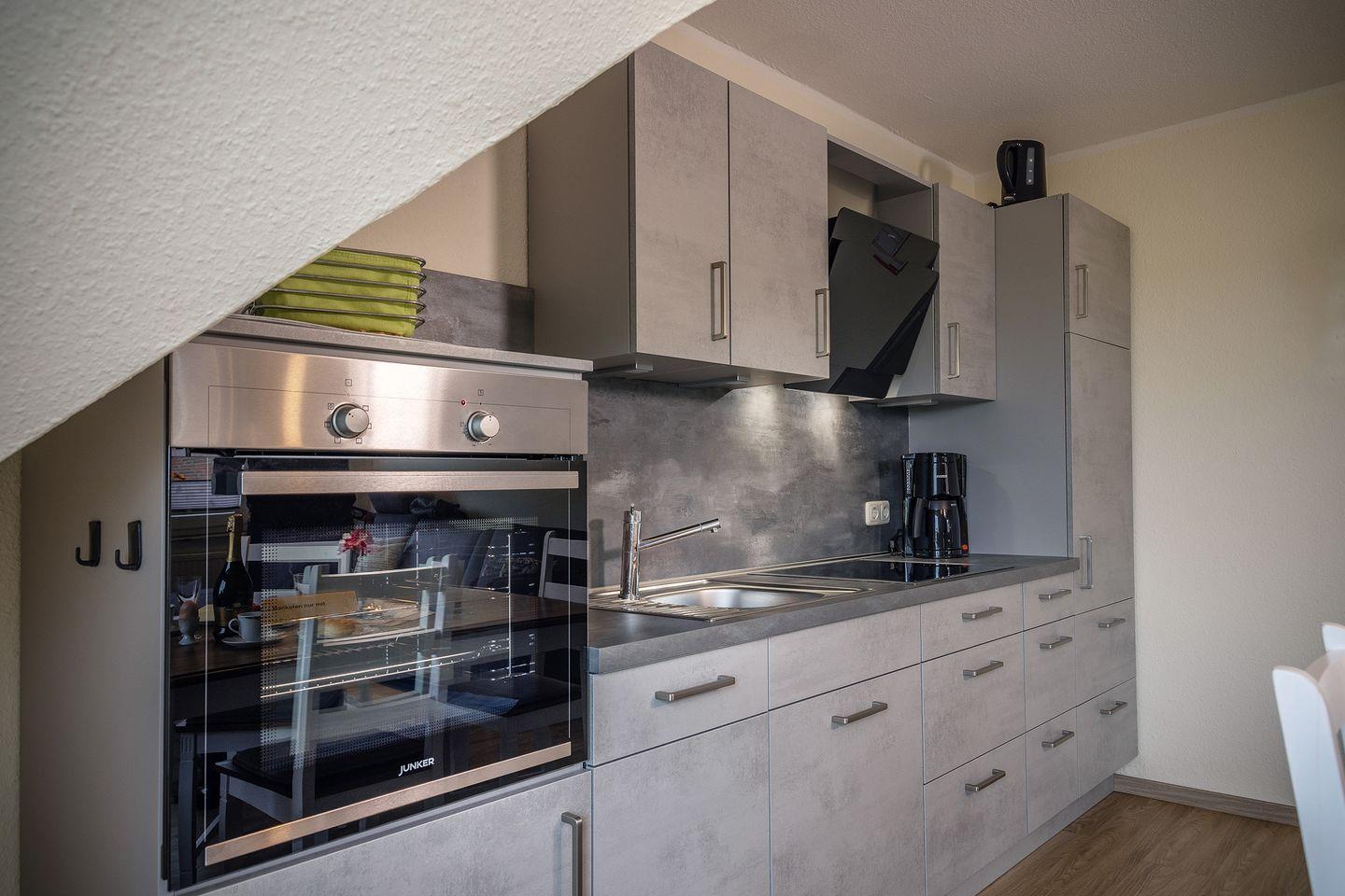 Ferienwohnung im Obergeschoss für max. 4 Personen, 60 qm, Stereoanlage, Satelliten TV, Küchenzeile mit Backofen, Geschirrspülmaschine und Mikrowelle, Fahrradabstellplatz, Gartenmöbel, Südbalkon mit freiem Blick in die Landschaft. WLAN ist inklusive.