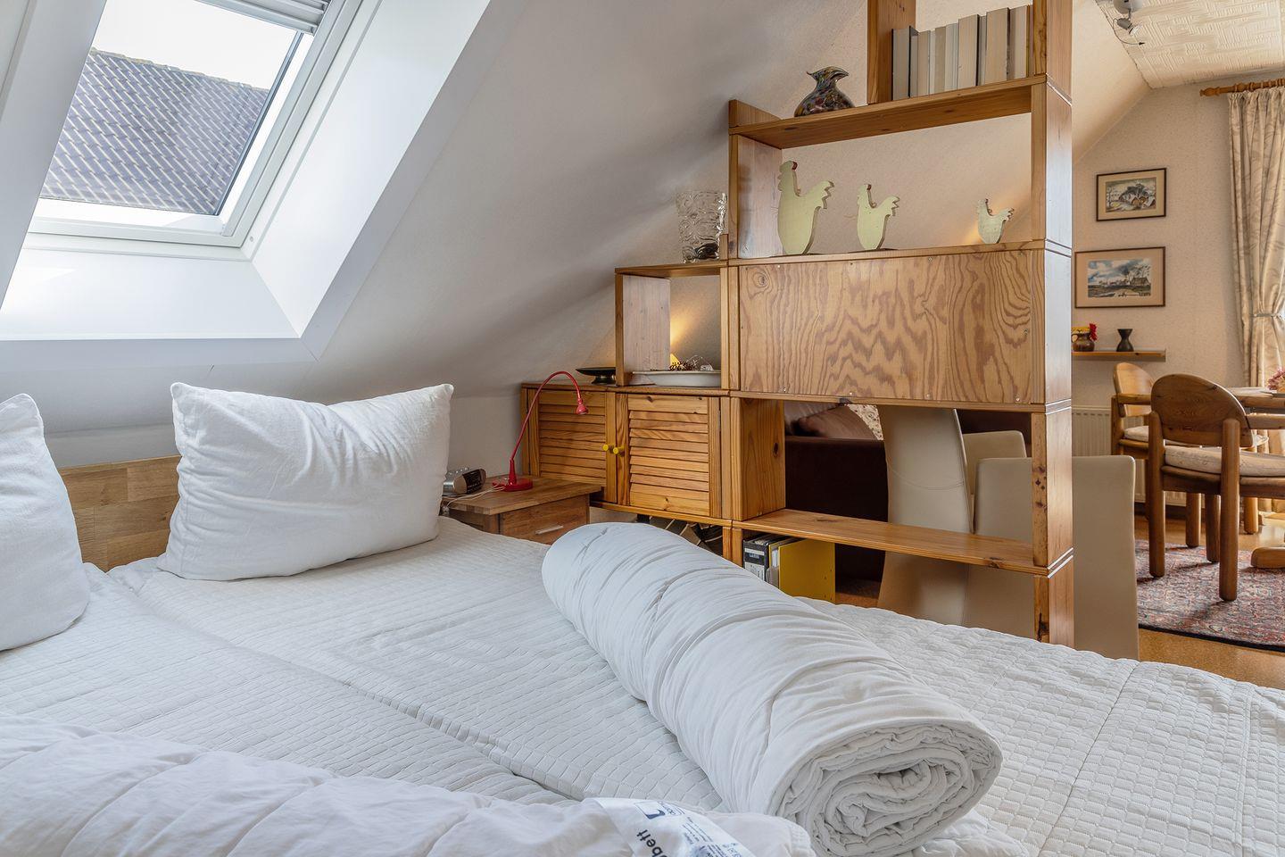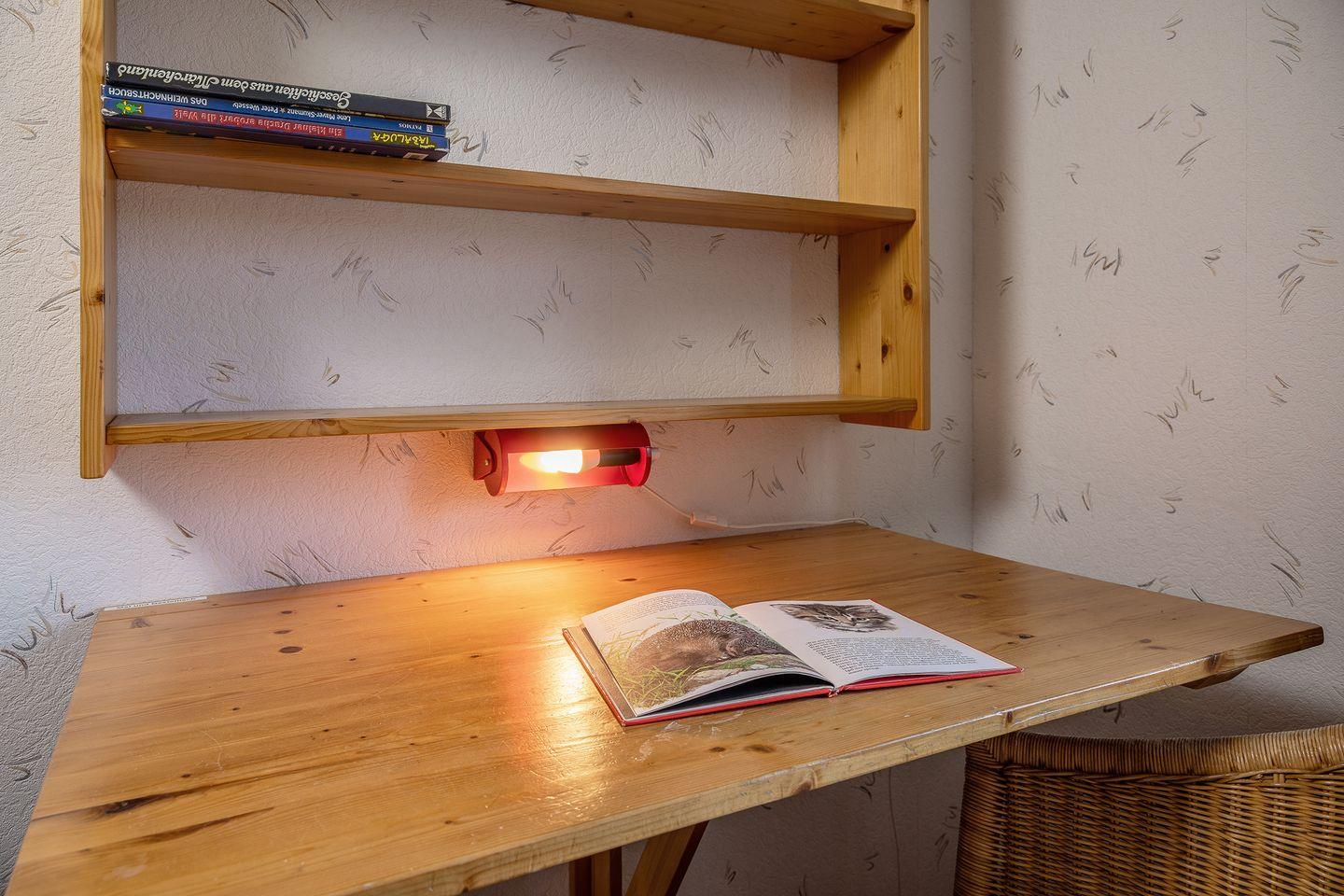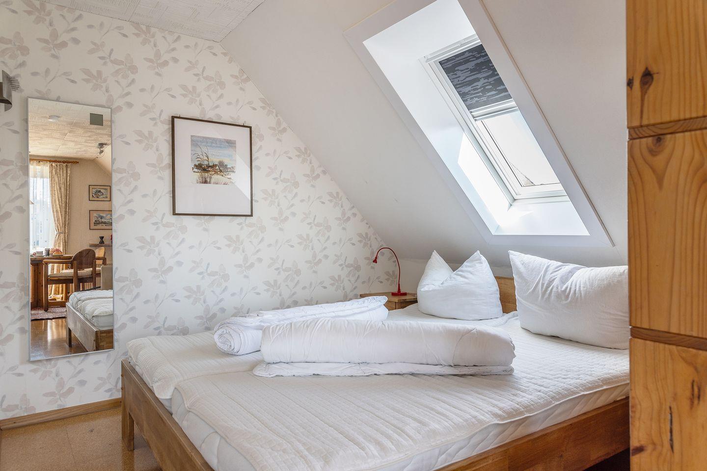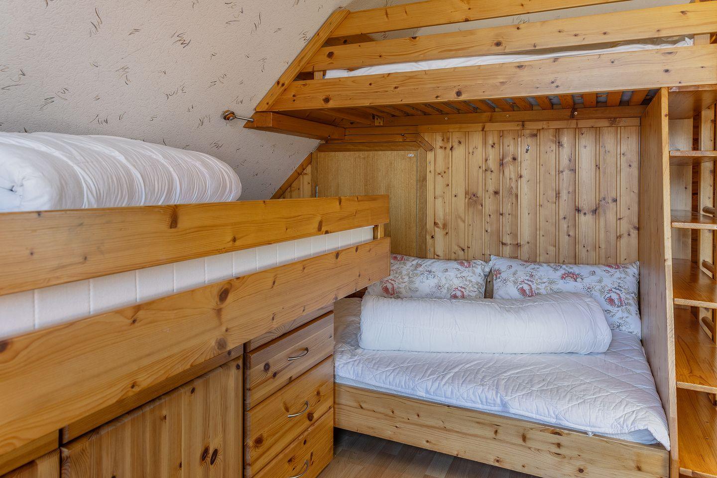 In der Wohnung befinden sich 2 Schlafräume. Die Ferienwohnung hat einen Elternschlafbereich (das Doppelbett ist durch einen Raumteiler vom Wohnzimmer getrennt) und ein Schlafzimmer mit zwei Betten auf verschiedenen Ebenen (nur für Kinder geeignet) und einem Kinderbettchen.