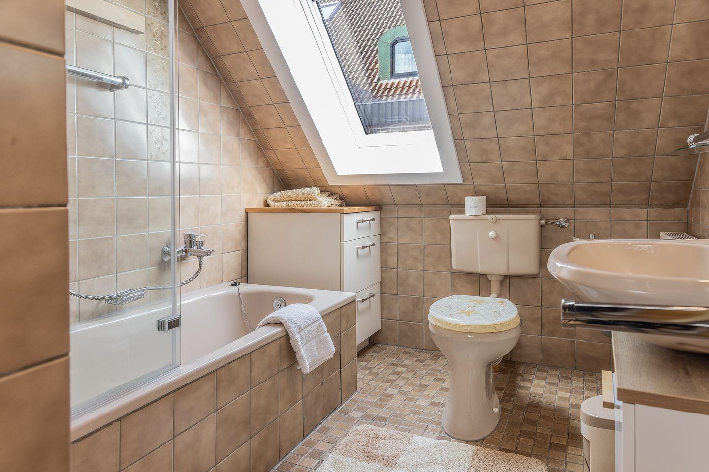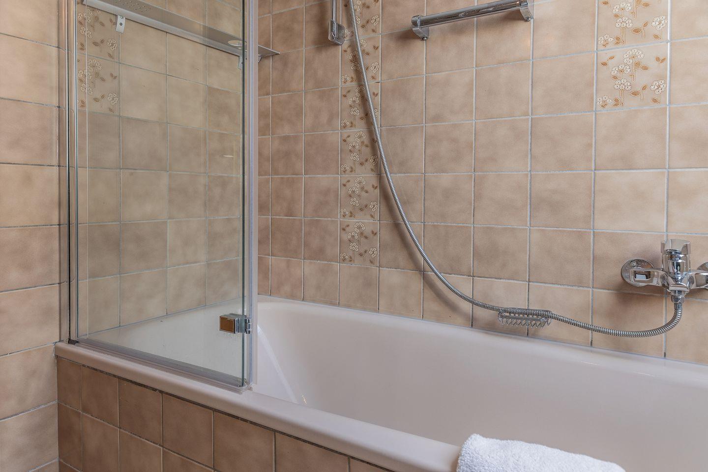Das Badezimmer hat einen Waschplatz, eine Wannendusche, ein WC sowie einen Fön.