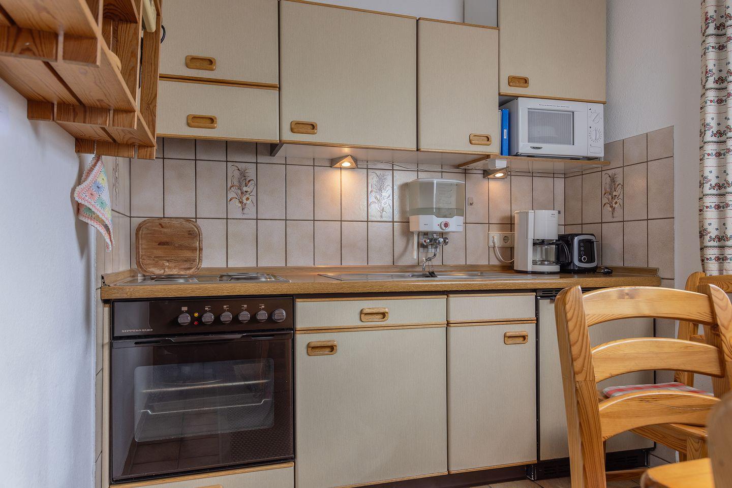 Separate Küche mit Essplatz und Kinderhochstuhl.