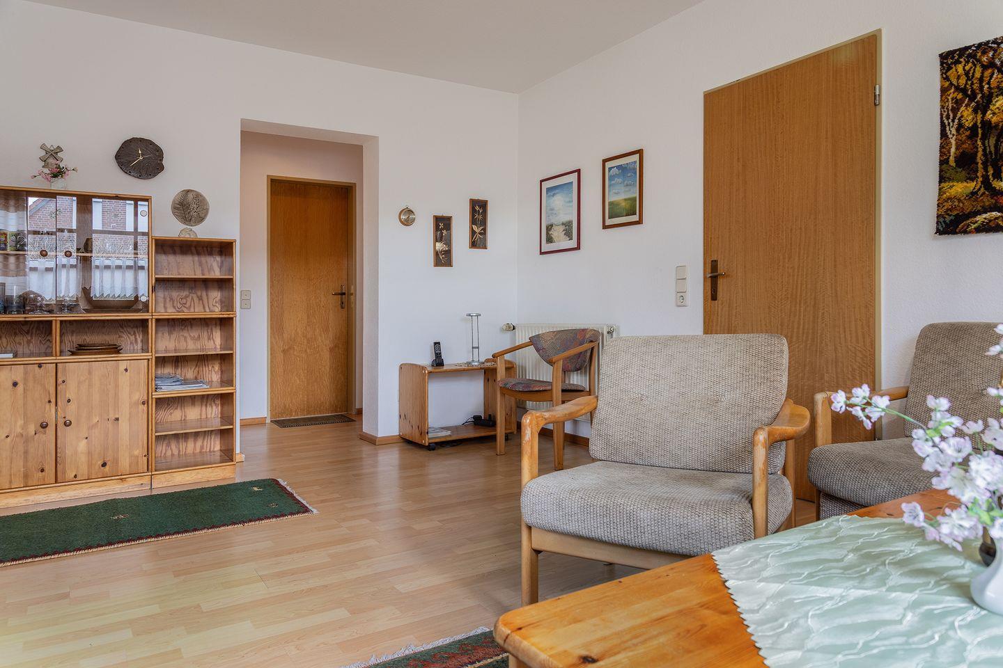 Helles, freundliches Wohnzimmer mit Radio, TV Zugang zur windgeschützten Terrasse mit großem Garten.