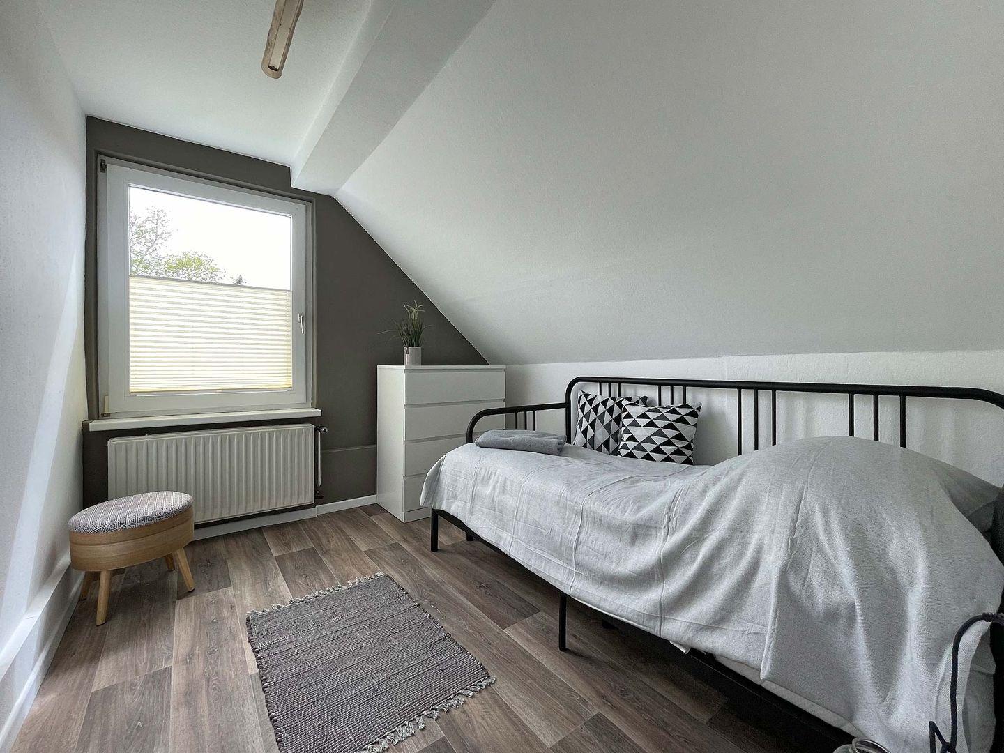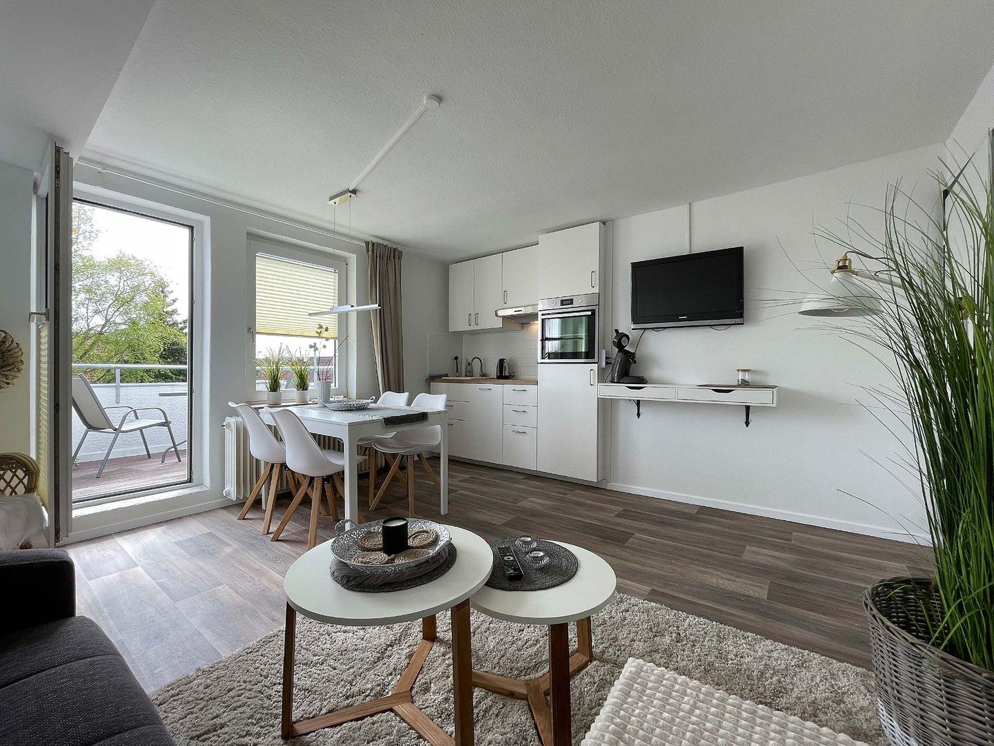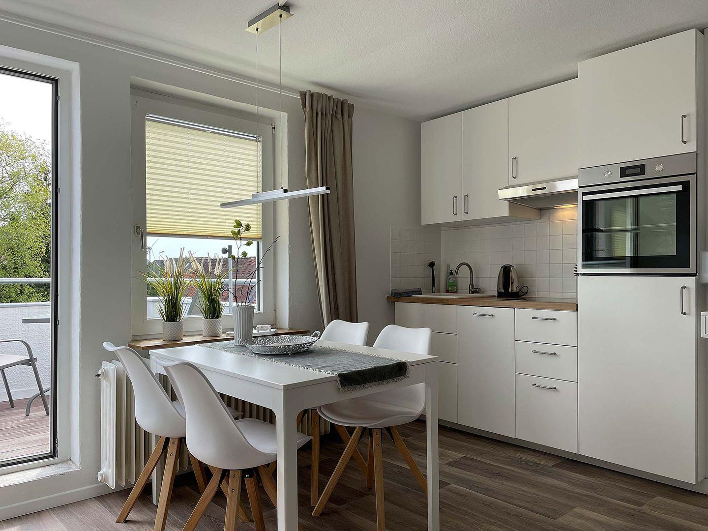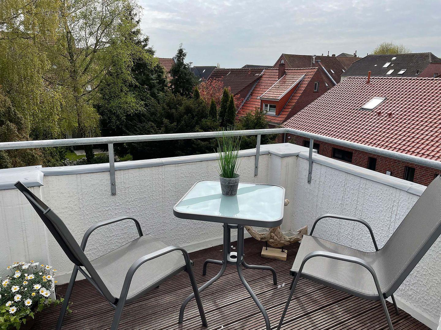 Die komplette Einrichtung lässt keine Wünsche offen. Der schöne Balkon bietet freien Blick in den grünen Garten und lädt zum Sonnen und Relaxen ein.