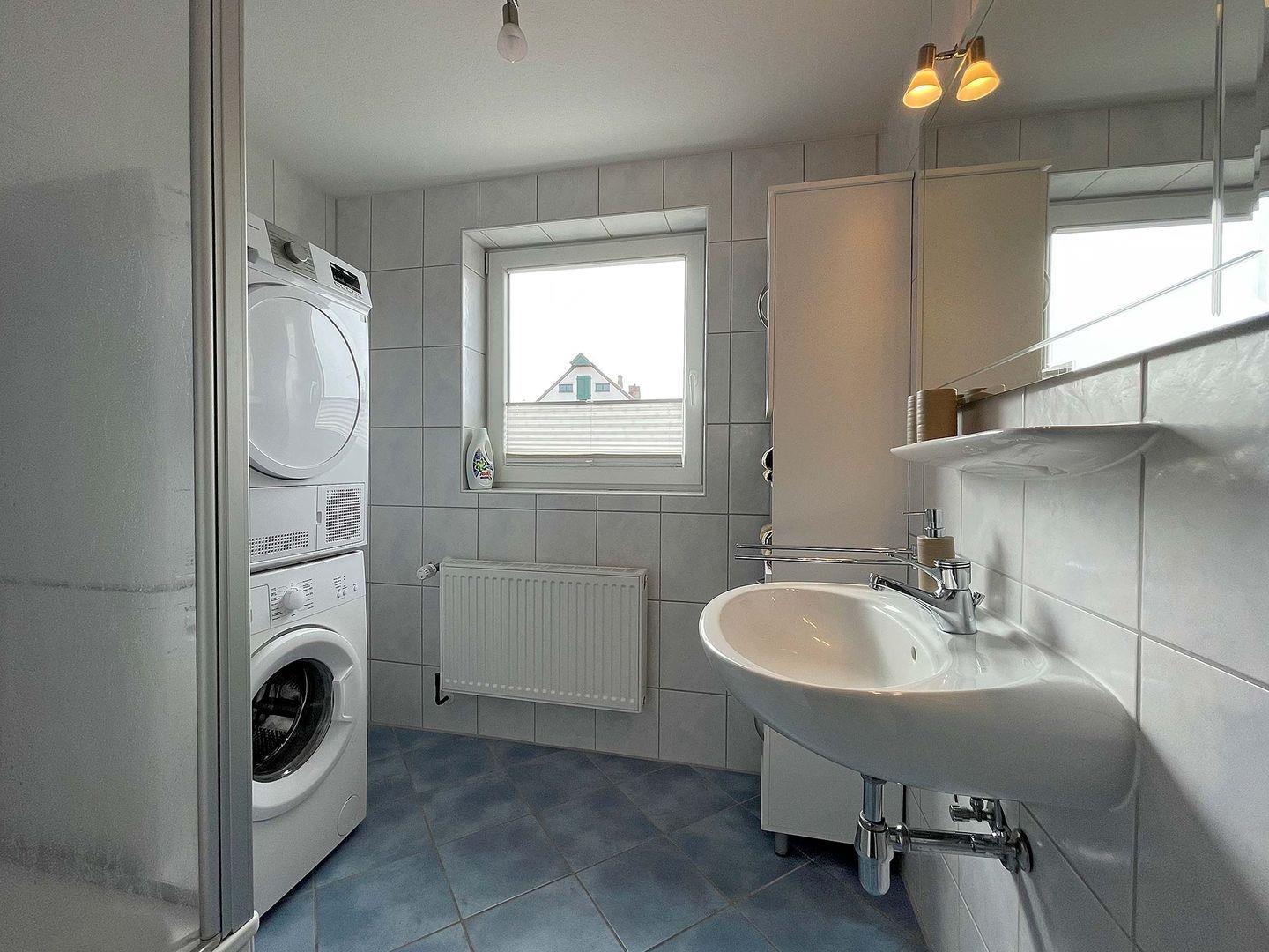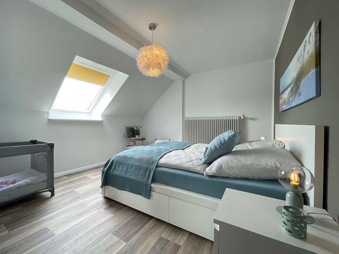 Die helle und modern eingerichtete Ferienwohnung mit sonnigem Balkon zur Gartenseite bietet viel Platz für 3 Erwachsene und 1 Kleinkind. Im großen Wohnraum mit komplett eingerichteter Küchenzeile und sonnigem Essplatz können Sie den Urlaub herrlich genießen. Im Elternschlafzimmer befinden sich ein bequemes Doppelbett,(Topper 160 x 200 cm) Kleiderschrank und ein Kinderreisebett. Im 2. Schlafraum fühlt sich ein weiterer Erwachsener wohl. Im Bad mit Fenster finden Sie neben Waschbecken und Dusche auch eine Waschmaschine mit Trockner. Das WC ist separat.