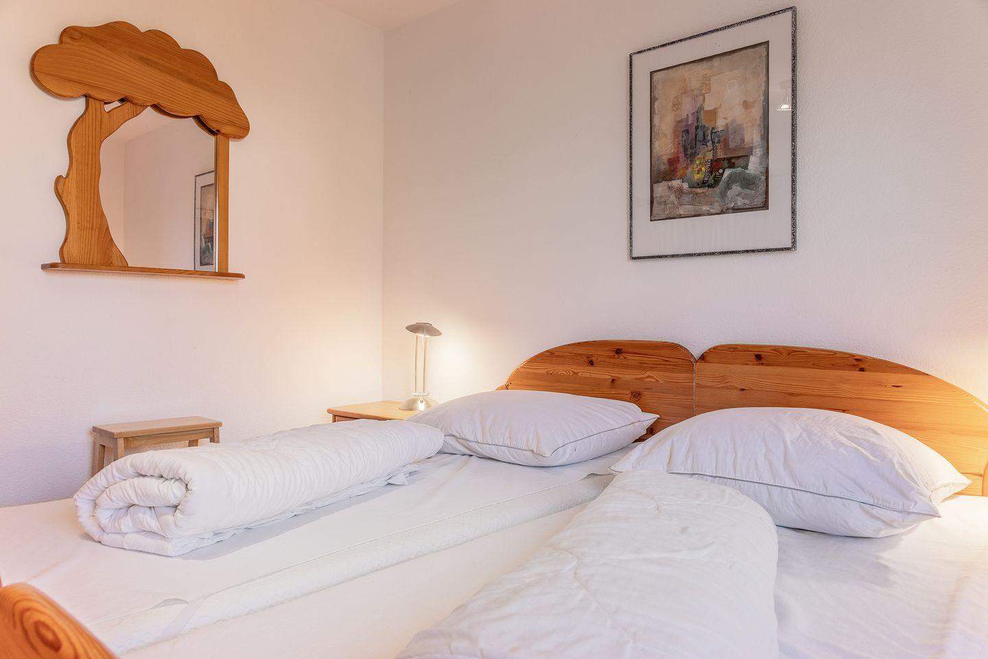 1 Schlafzimmer mit Etagenbett und einer kleinen Sitzecke, Bad mit Dusche, WC und Waschmaschine