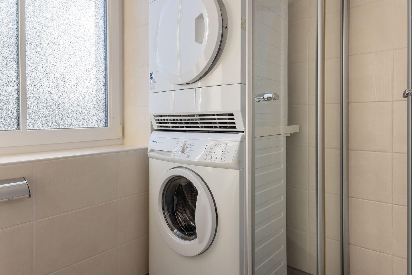 Bad mit ebenerdiger Dusche und WC sowie Waschmaschine und Trockner