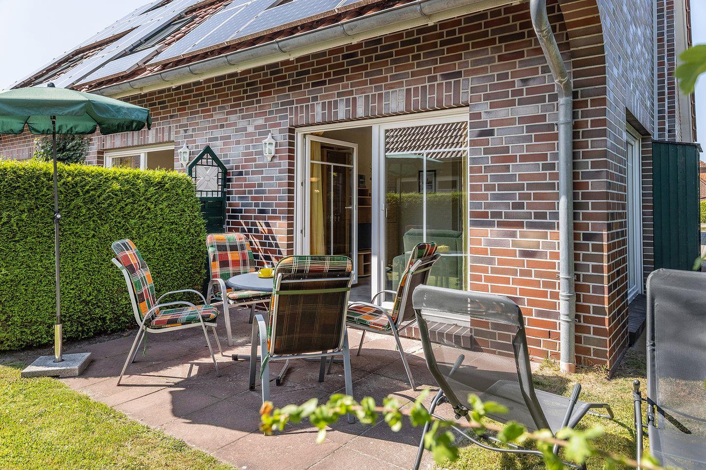 Wohn-/Essbereich mit Sat- TV, Stereoanlage, offene Küche, Kinderhochstuhl, Gäste- WC, Waschmaschine/ Trockner, Abstellraum, Terrasse mit Garten in Südlage, Gartenmöbel.
