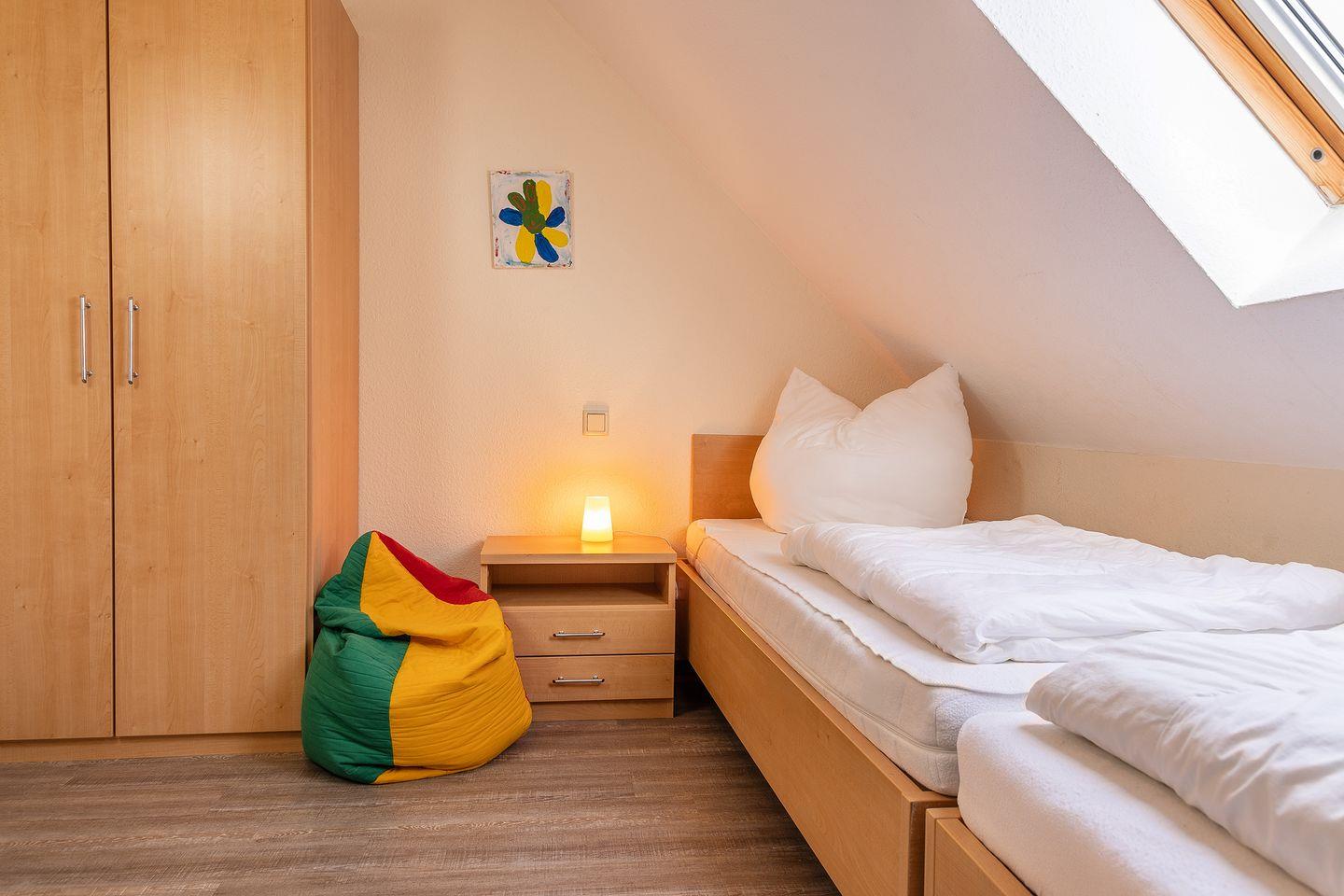 1 Schlafzimmer mit Doppelbett, 1 Schlafzimmer mit 2 Einzelbetten, zustellbares Kinderbett, Latexmatratzen, allergikerfreundliches Bettzeug, Bad mit Dusche.