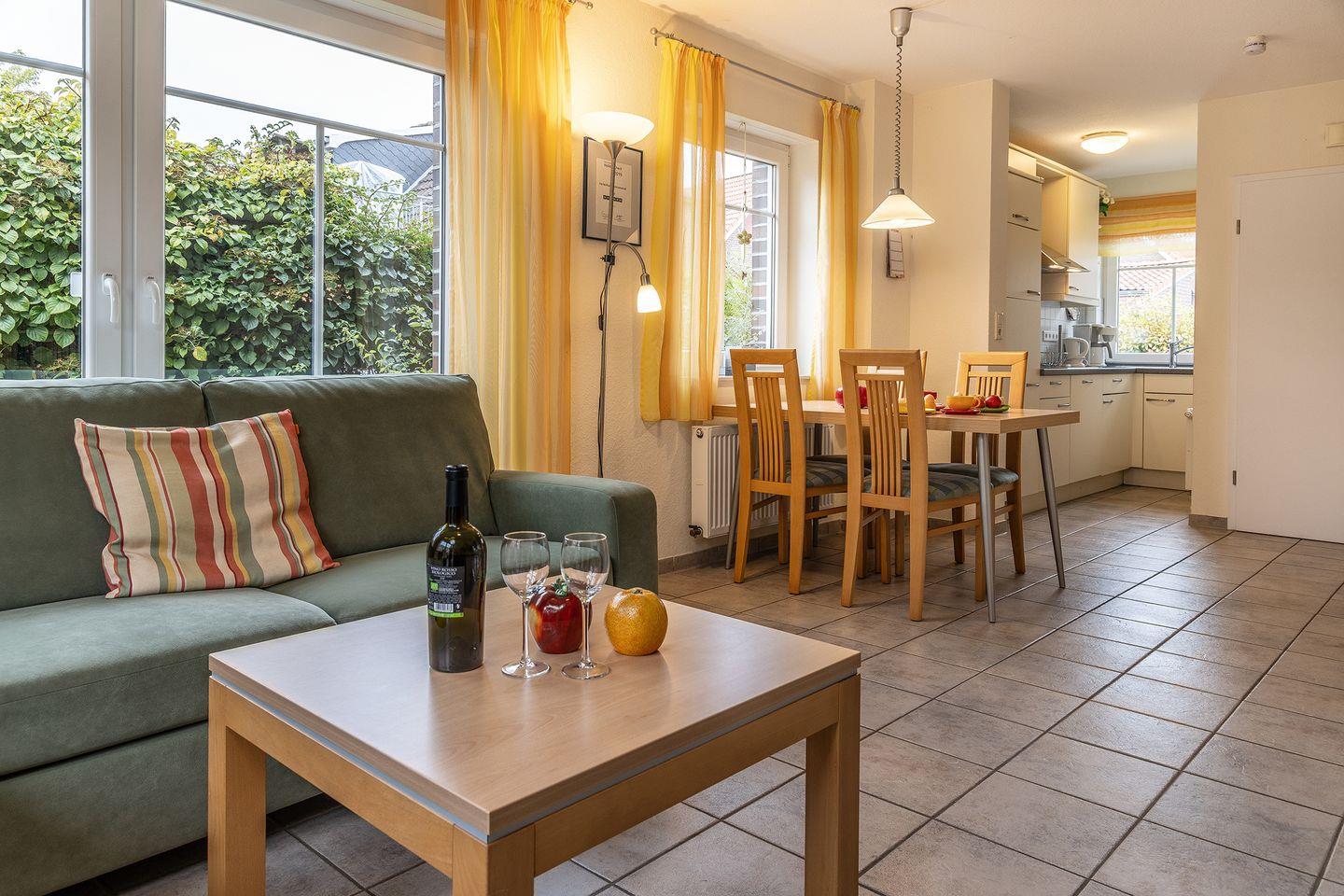 Wohn-/Essbereich mit Sat- TV, Stereoanlage, offene Küche, Kinderhochstuhl, Gäste- WC, Waschmaschine/ Trockner, Abstellraum, Terrasse mit Garten in Südlage, Gartenmöbel.