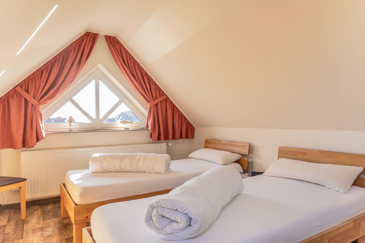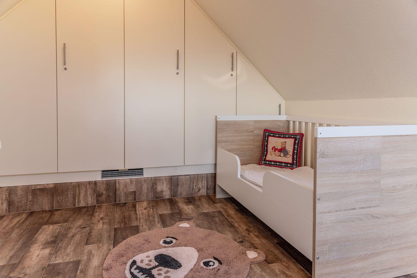 Schlafzimmer mit 2 Einzelbetten, Fernseher mit DVD- Player und Kinderbett
