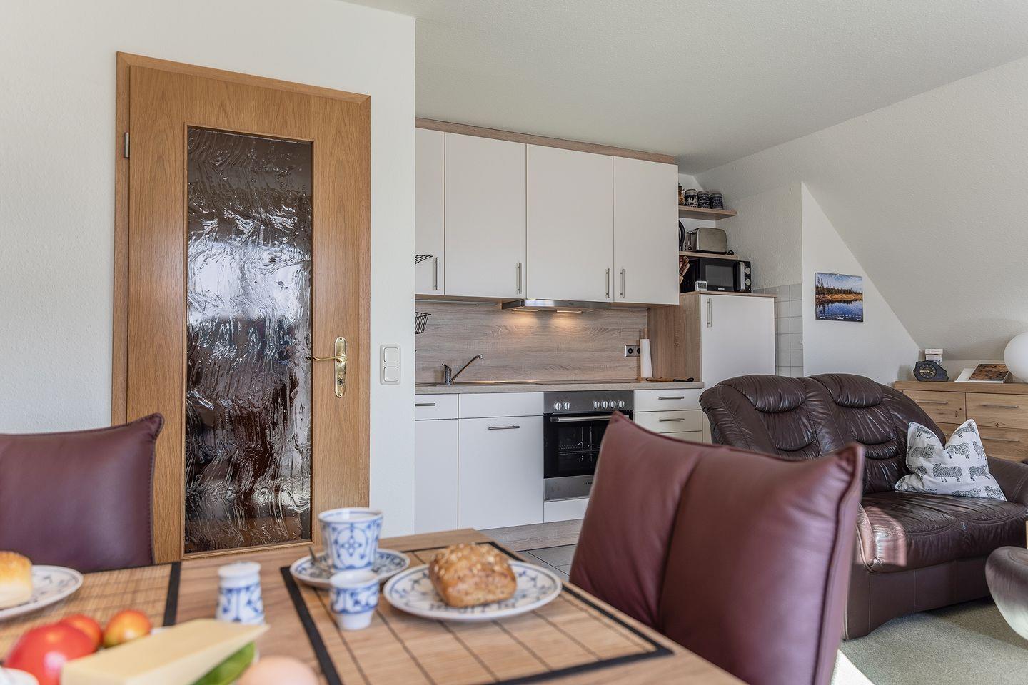 Wohnzimmer mit Sat -TV (Flachbild), Stereoanlage mit CD-Player, Südbalkon, angrenzende Küche, Esstisch mit 4 Stühlen, Bad mit