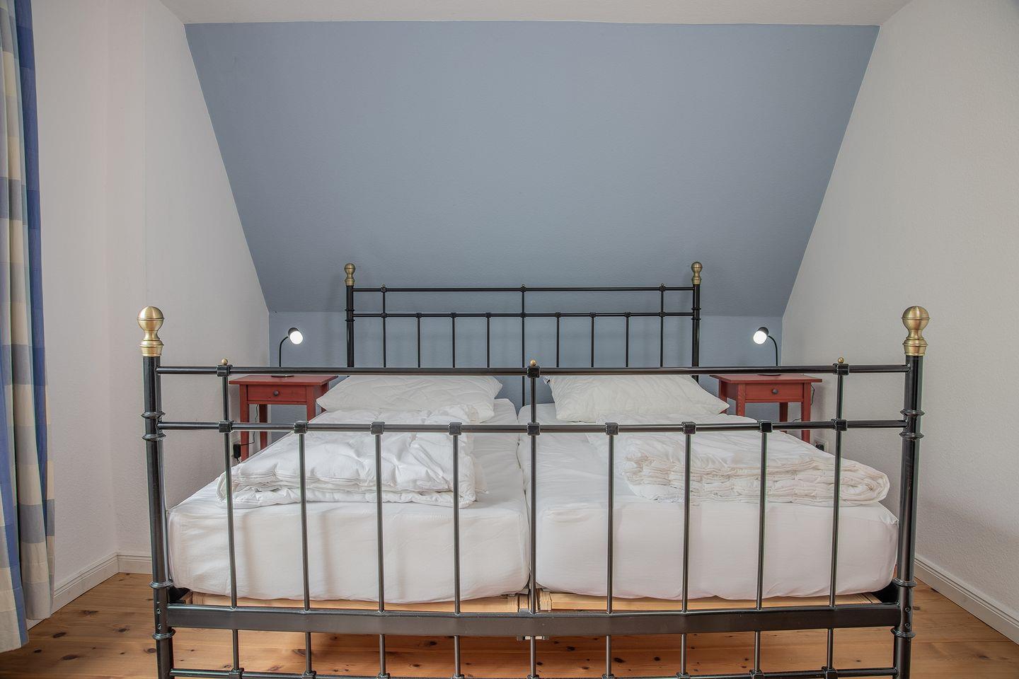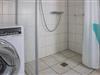 1 Schlafzimmer mit Doppelbett und dahinter liegend 1 Schlafzimmer mit Etagenbett und angrenzendes Bad mit ebenerdiger Dusche, WC und Waschtrockner.