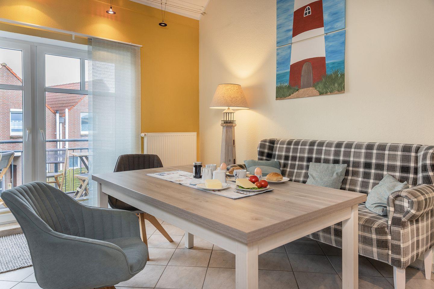 Großer Wohn-/Essraum mit Sat -TV, Stereoanlage, angrenzende große Küchenzeile mit Essplatz und Kinderhochstuhl, Ausgang zum Balkon.