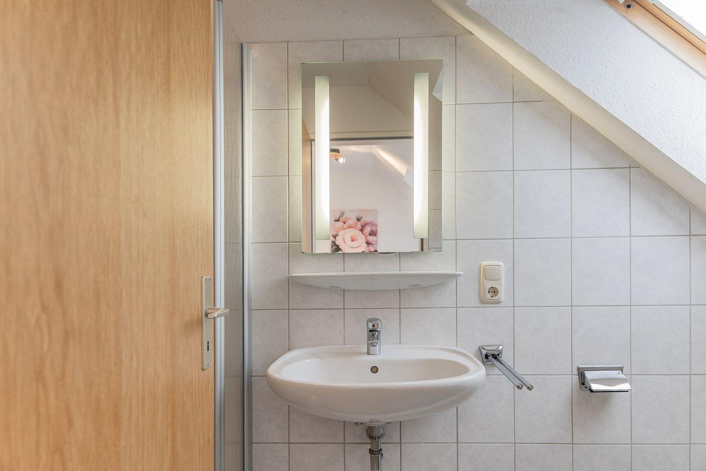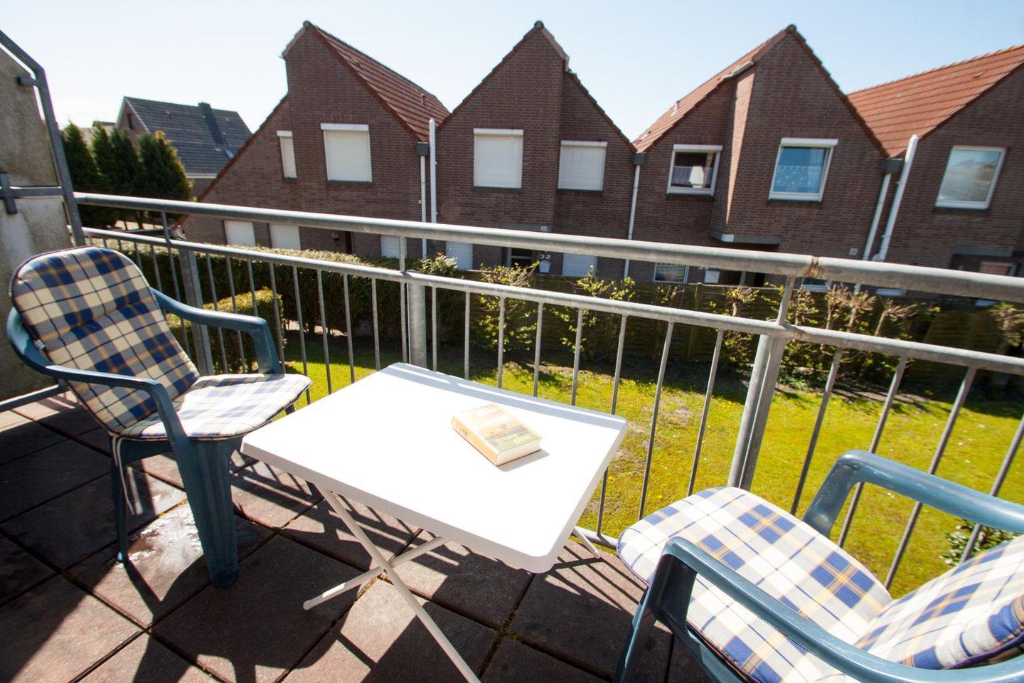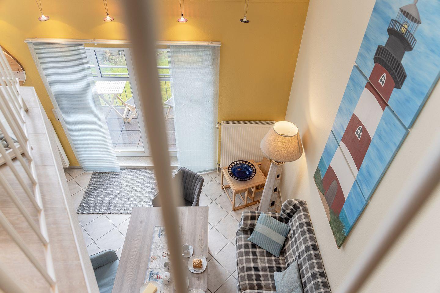 1 Schlafzimmer mit Doppelbett, Bad mit Dusche und WC, vor dem Schlafzimmer befindet sich eine kleine Galerie mit Sitzplatz.