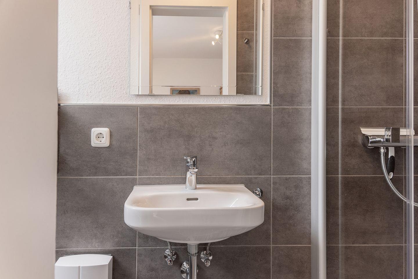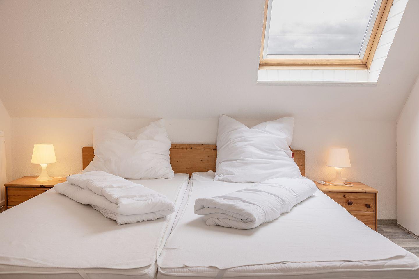 Schlafzimmer mit Doppelbett, modernes Bad mit Dusche/WC.