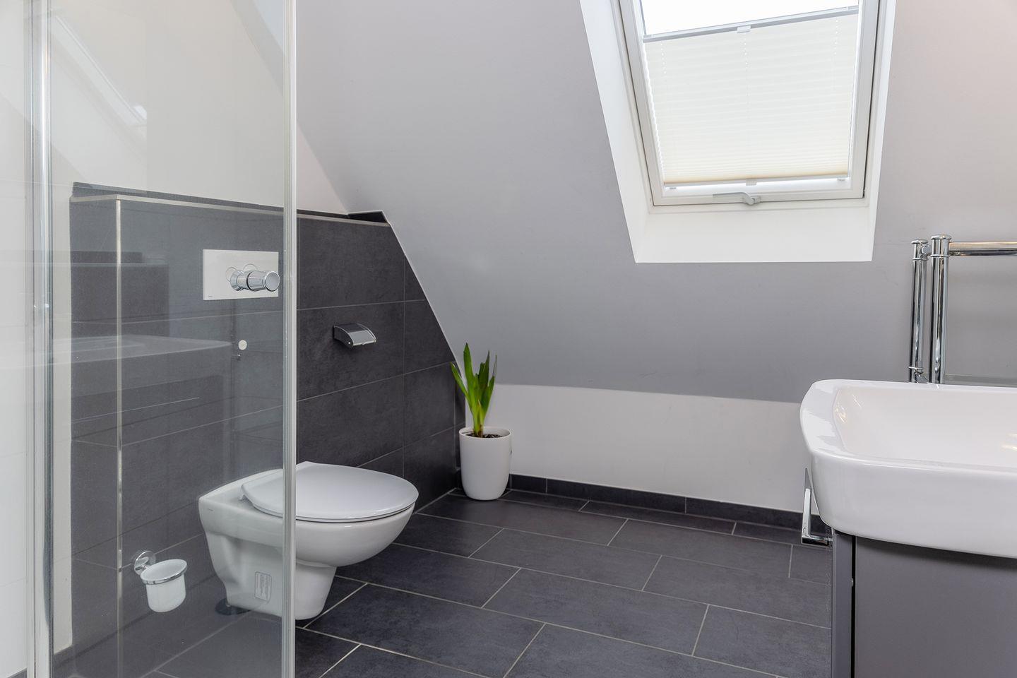Bad mit Dusche (ebenerdig) und WC, Abstellraum mit Waschmaschine