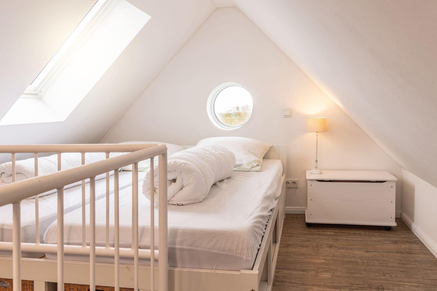 2. Schlafzimmer mit Doppelbett auf der 2. Ebene, über die Wendeltreppe erreichbar.