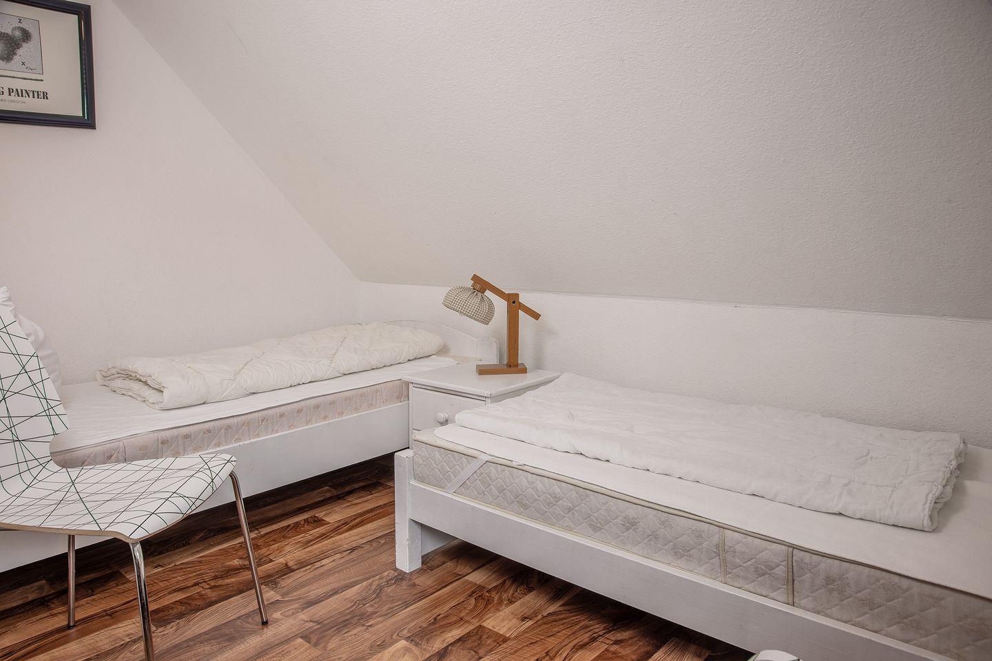 Im Obergeschoss befinden sich 2 Schlafzimmer (1x mit Doppelbett, 1x mit 2 Einzelbetten), zustellbares Kinderreisebett, separates WC.