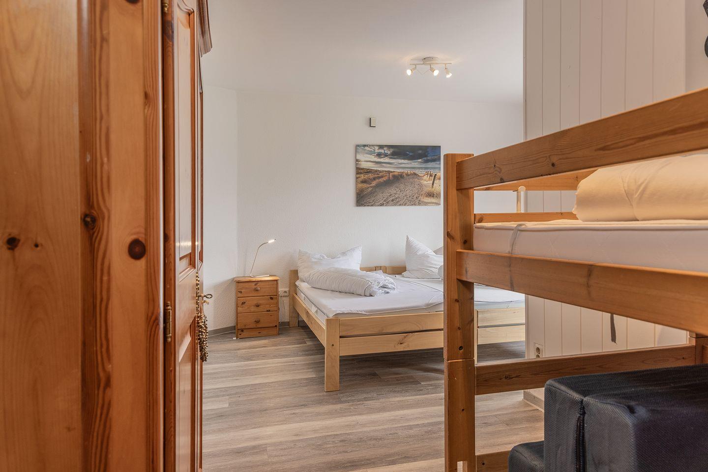 1 Schlafzimmer mit zwei Einzelbetten (nebeneinander) und zusätzlichem Einzelbett (Hochbett).