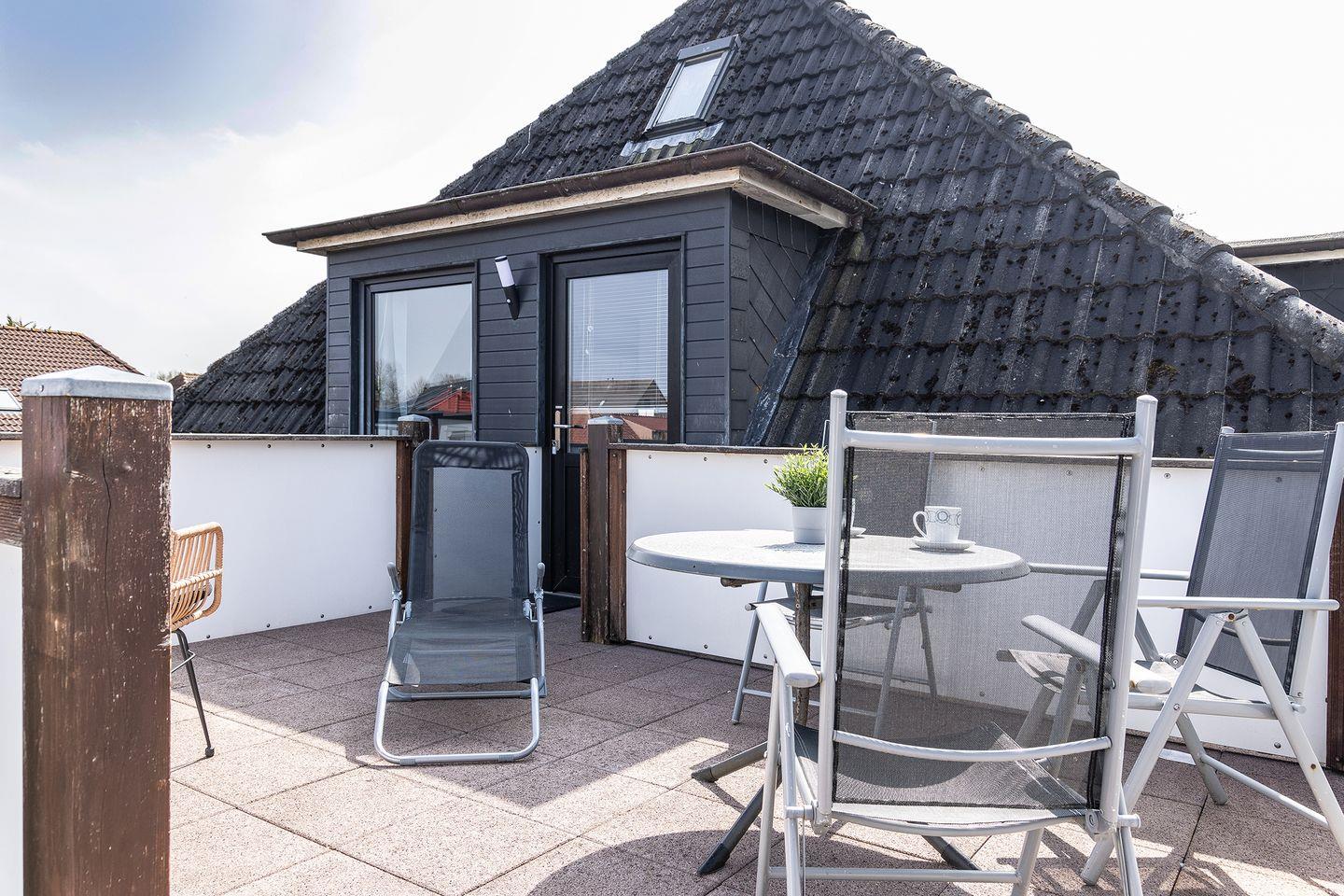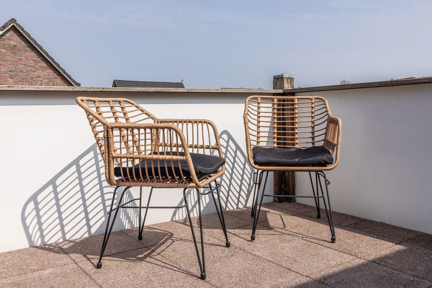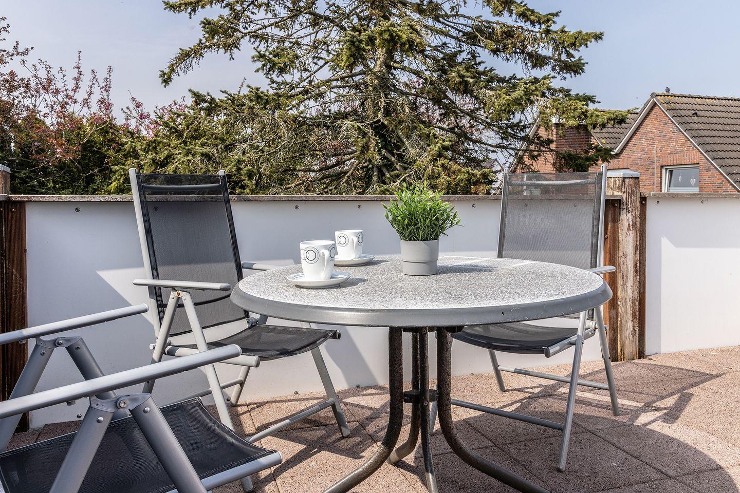 private Terrasse mit Gartenmöbeln, zwei Sonnenliegen und Sonnenschirm