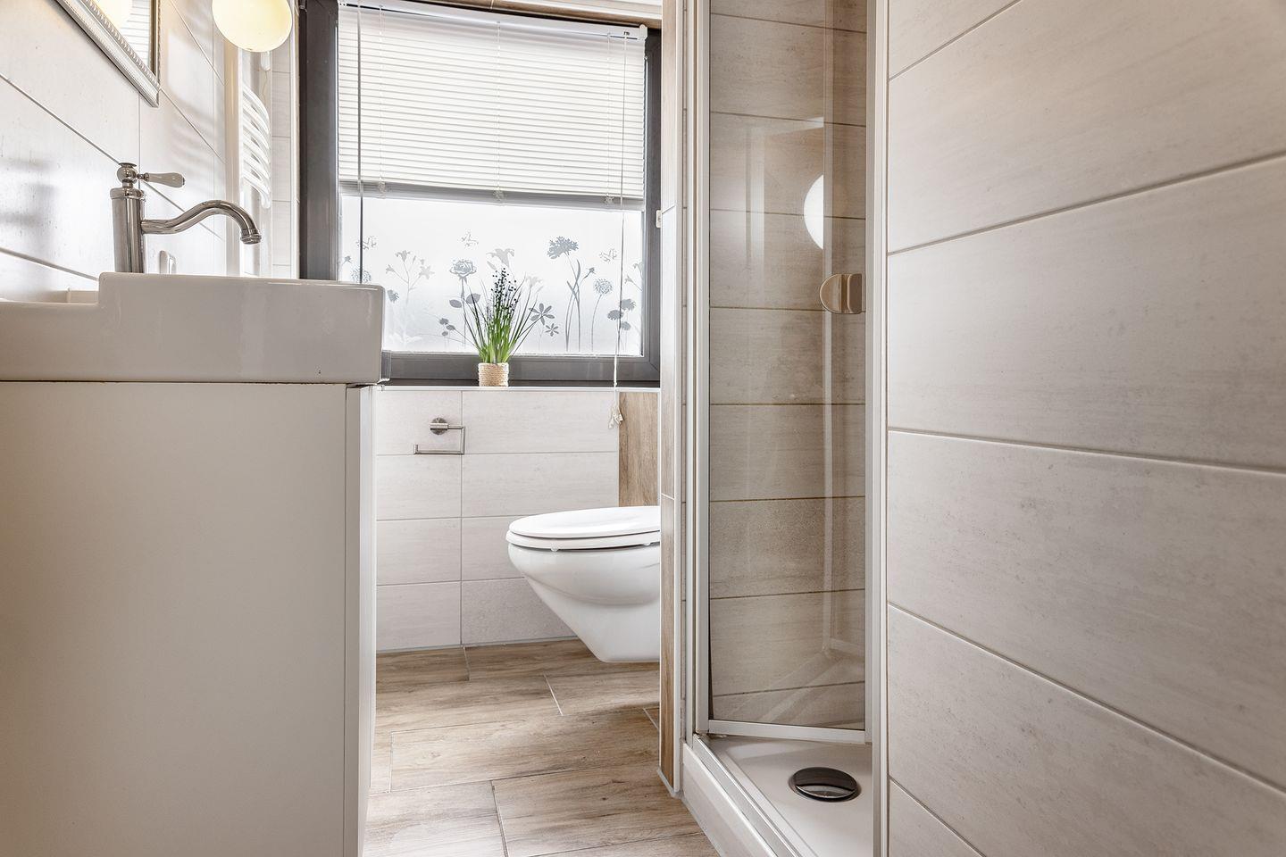 Dusche mit Regendusche, Toilette, Handwaschbecken & Haartrockner