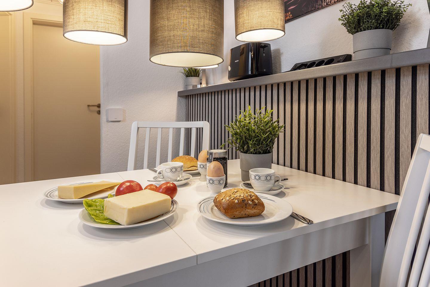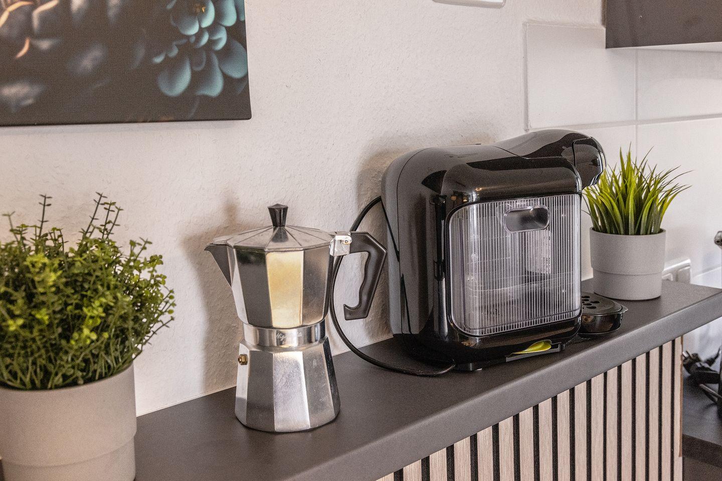 Essgruppe und komplett ausgestattete Küchenzeile u.a. mit Herd, Backofen, Kühlschrank mit Gefrierfach, Mikrowelle, Kapselkaffeeautomat Tassimo Vivy 2, Filterkaffeemaschine, Espressokocher, Wasserkocher, Toaster, Mixer, Kochtöpfe, Pfanne, Geschirr, Besteck, Gläser & weiteres Küchenzubehör