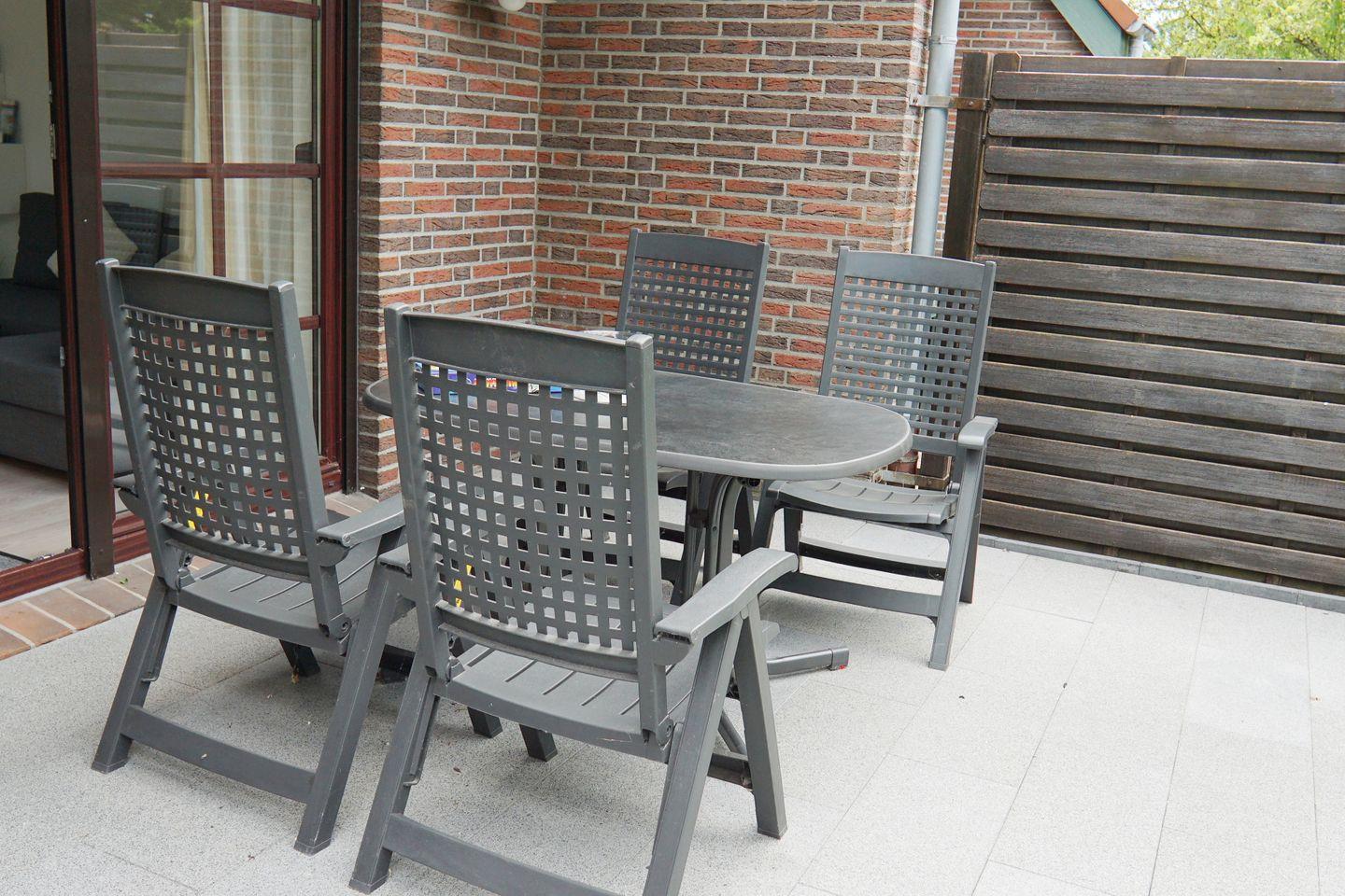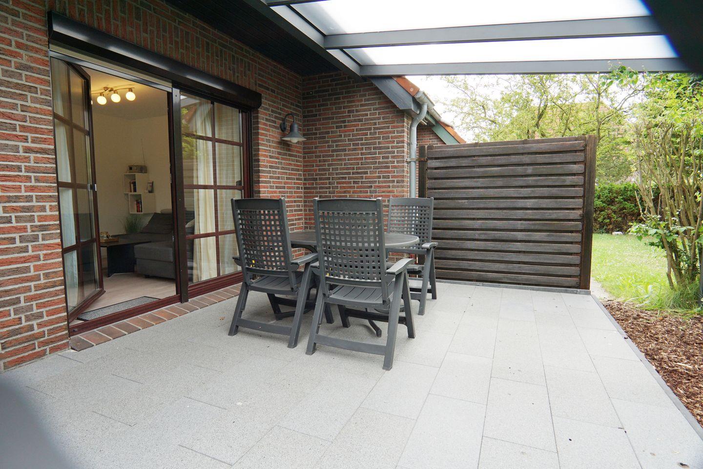 Wohn-/Esszimmer mit Sat- TV, Radio, Kinderhochstuhl. Separate Küche, Gäste- WC, Abstellraum, Terrasse mit kleinem Garten in Südlage, Gartenmöbel.