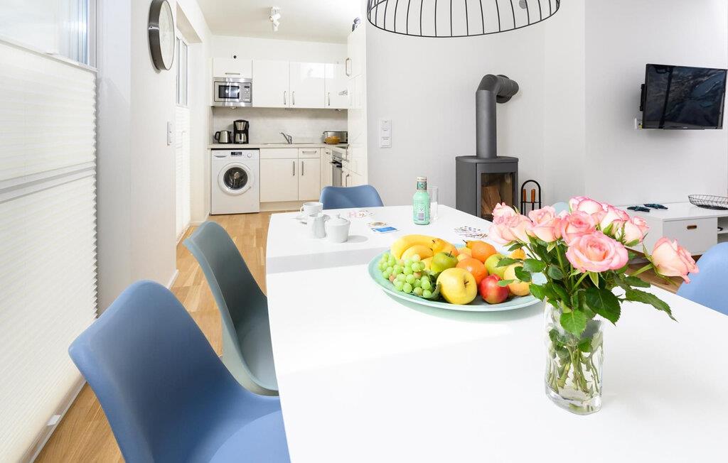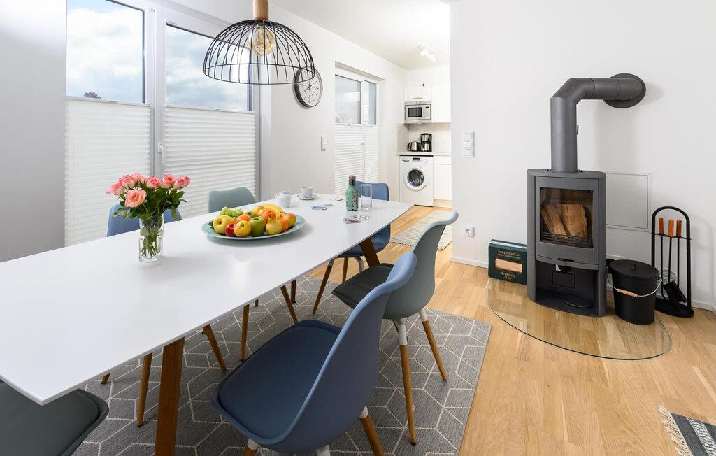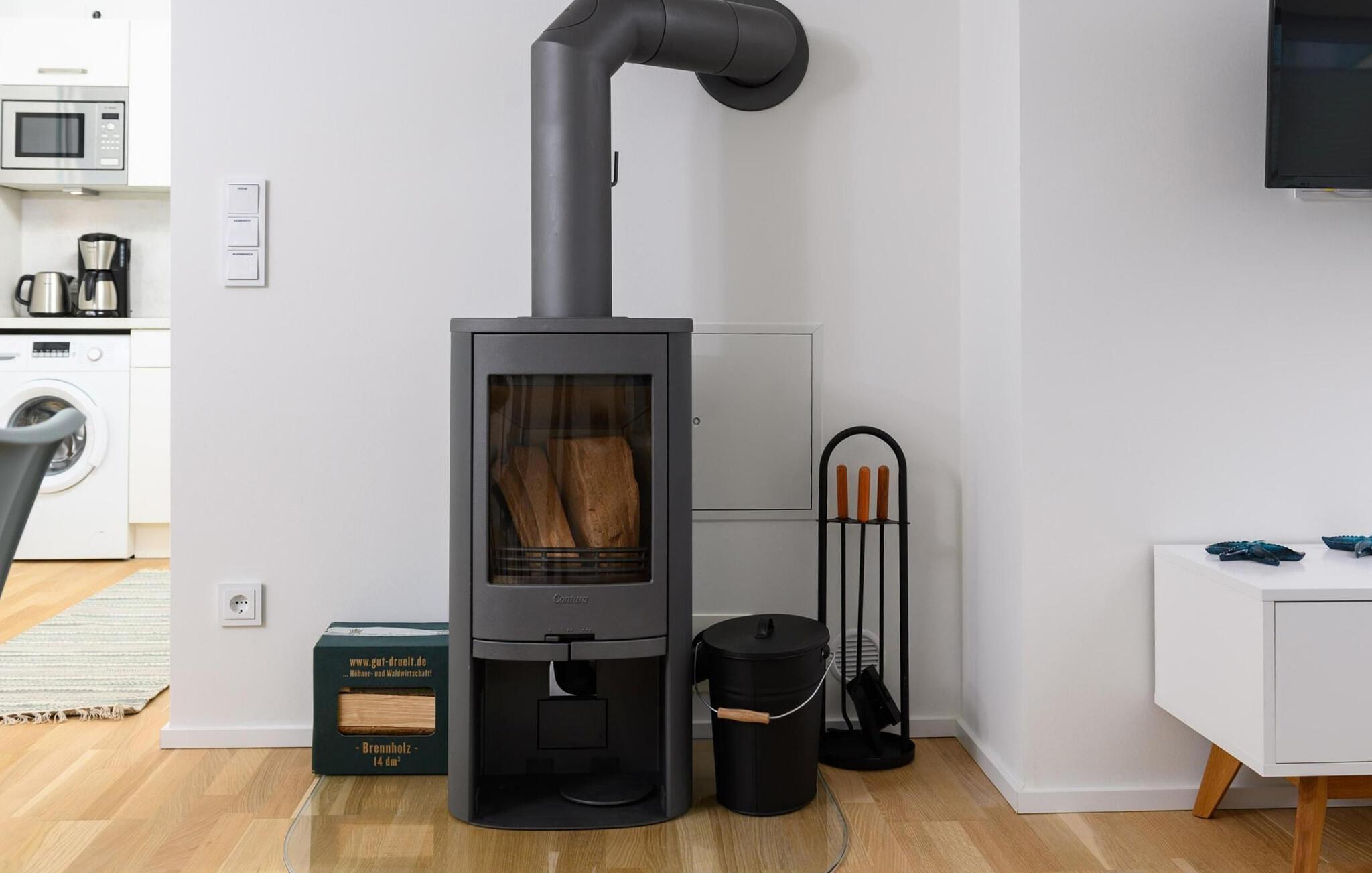 Det bliver romantisk foran pejsen i den hyggelige opholdsstue. Indendørs underholdning leveres af Wi-Fi og Smart TV med et Telekom hjemmeunderholdningsprogram på dage med dårligt nordisk vejr.